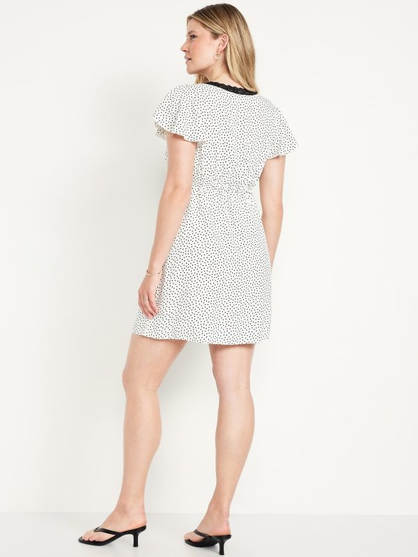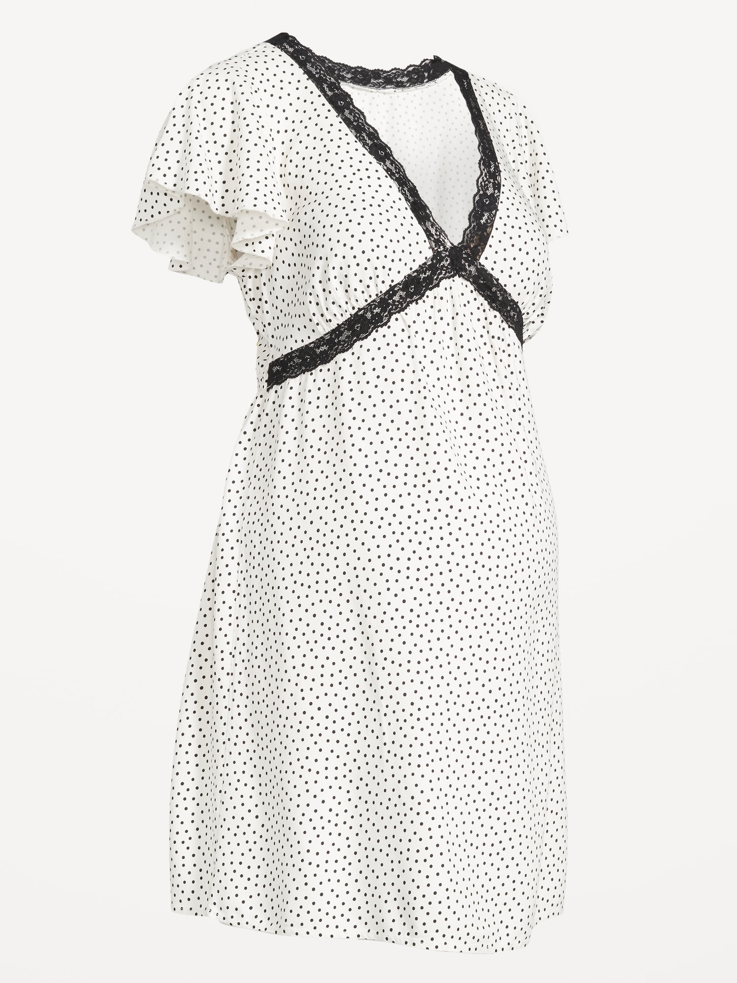 Maternity Crepe Lace-Trim Mini Dress: lace-trim v-neck, short flutter sleeves, elasticized back waist, shirred detail, seamed bodice, #775072