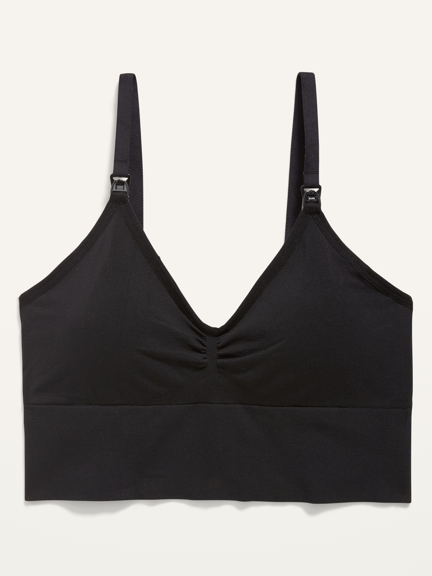 Maternity High Support Hands-Free Pumping Bra: Wide adjustable shoulder straps, with detachable clips for convenient nursing access. Clips can also be adjusted to racerback styling., Sweetheart neckline., Shaped cups with removable pads for convenient nursing access., Built-in underlayer, with wide slits for hands-free pumping., Banded elastic hem, with adjustable hook-and-eye strap at center back for easy wear & a personalized fit., Super-soft double-layer nylon, with comfortable stretch., #876724