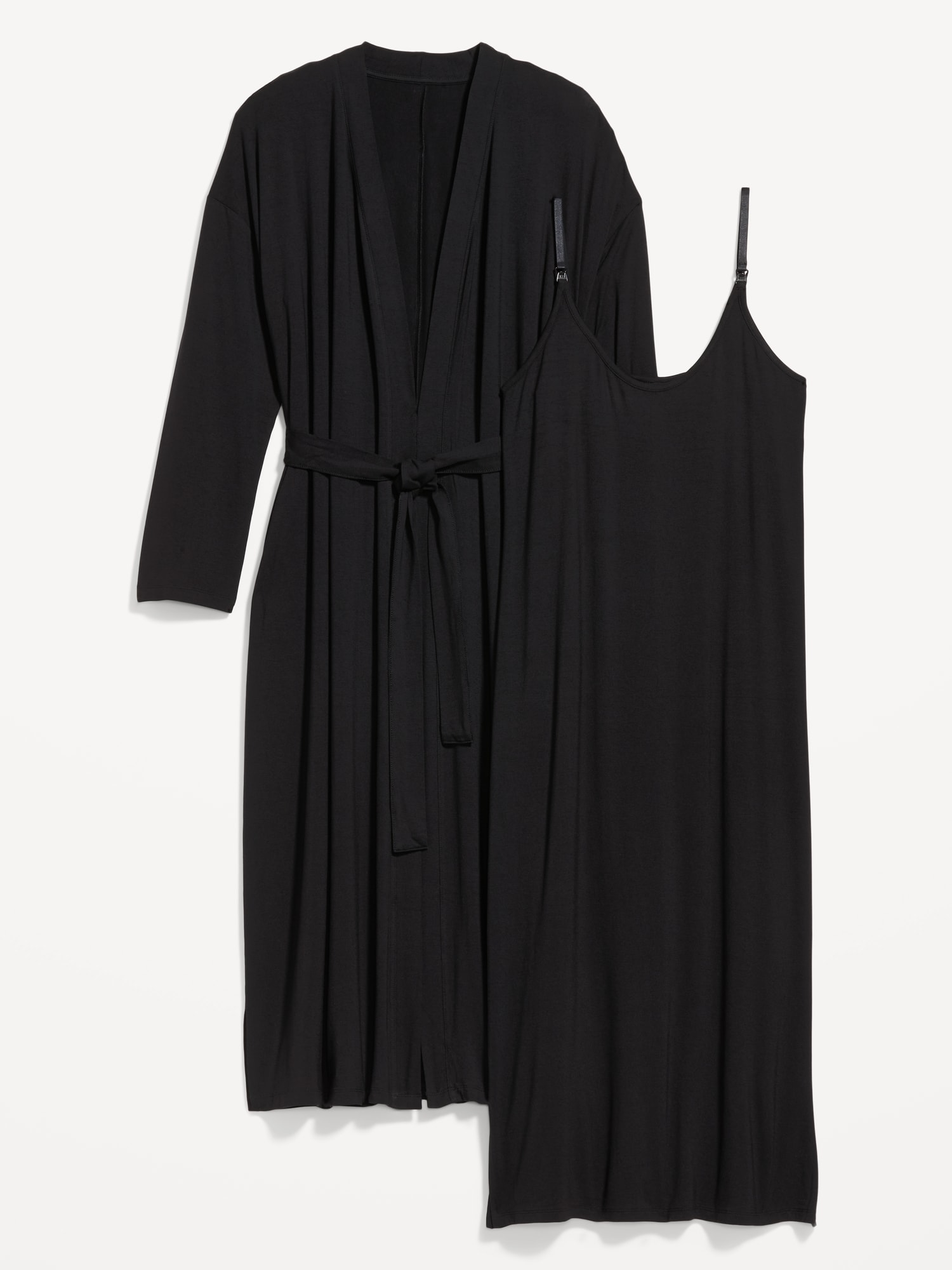 Maternity Robe and Nursing Nightgown Set: includes bathrobe and matching cami nightgown, robe has long sleeves, removeable tie belt and on-seam pockets, nightgown has detachable clips at spaghetti straps, built-in shelf bra for convenient nursing, #465767