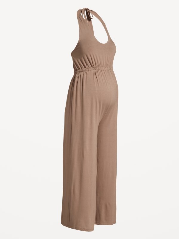 Maternity Waist-Defined Halter Jumpsuit: perfect for baby shower, tie-back halter neck, sleeveless, elastic waistband, on-seam pockets, wide leg, #719575
