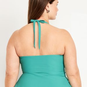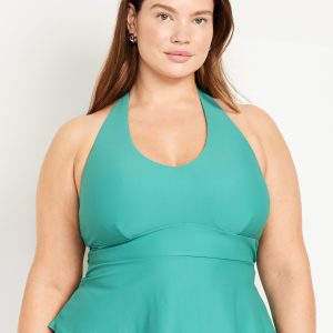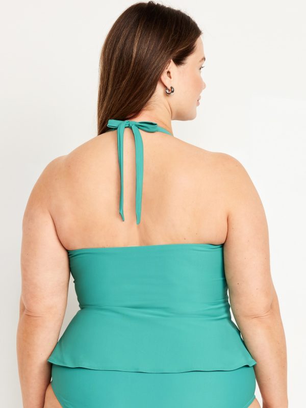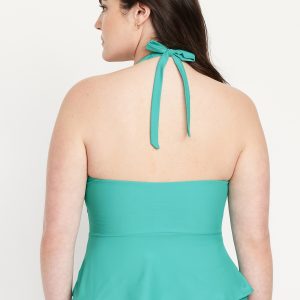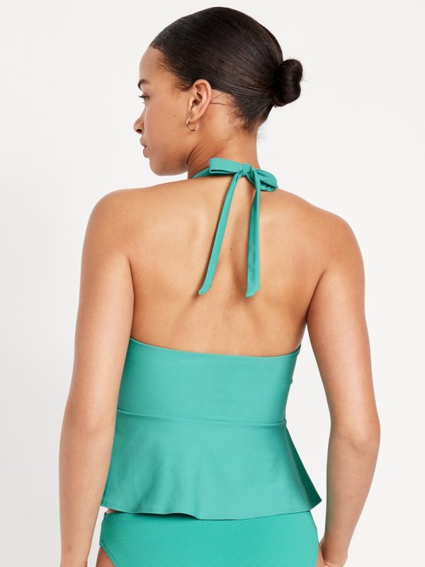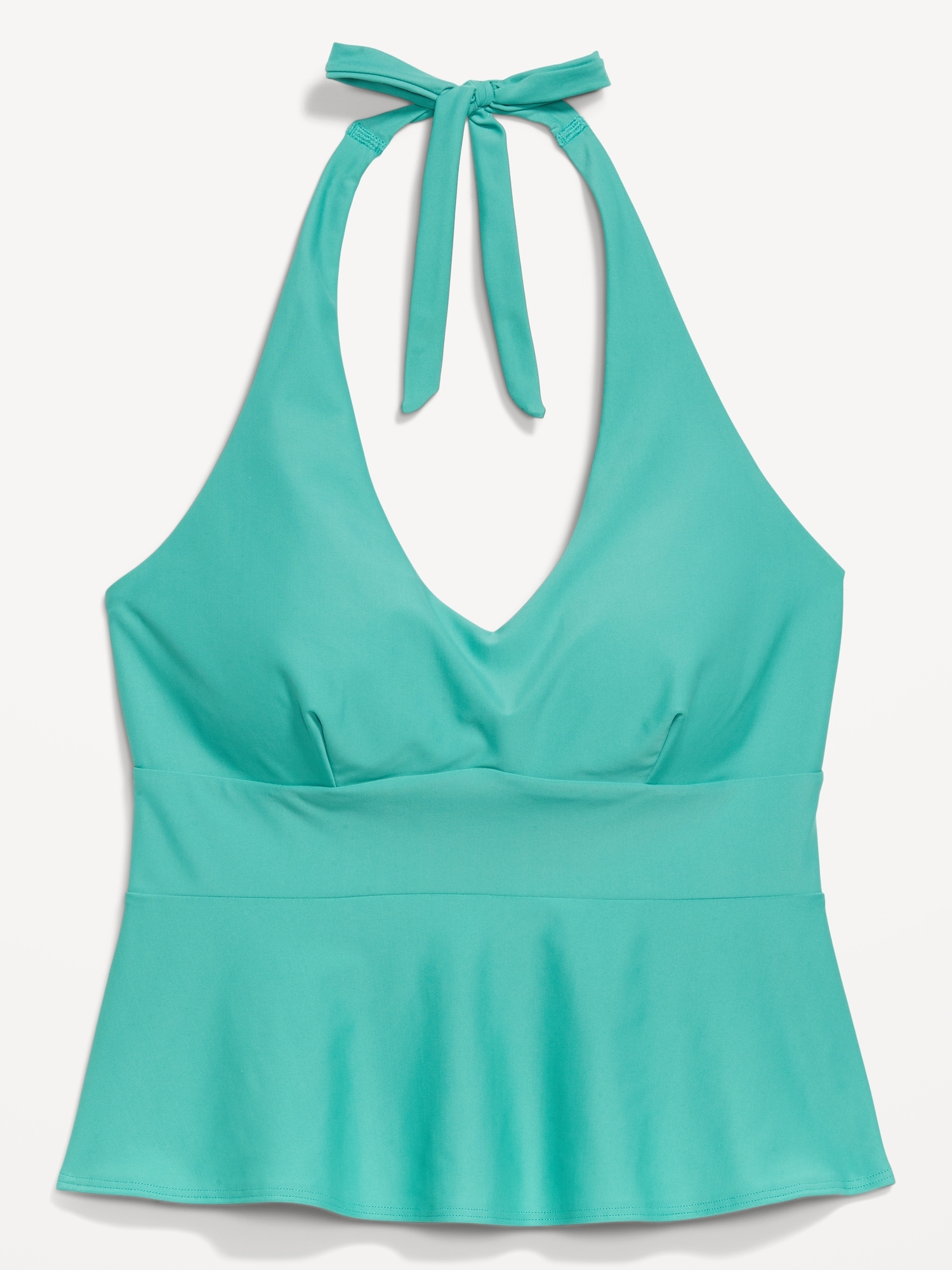 Matte Tankini Swim Top: v-neck, halter tie straps, removable pads, seamed empire waist, darted bust, peplum hem, #660892