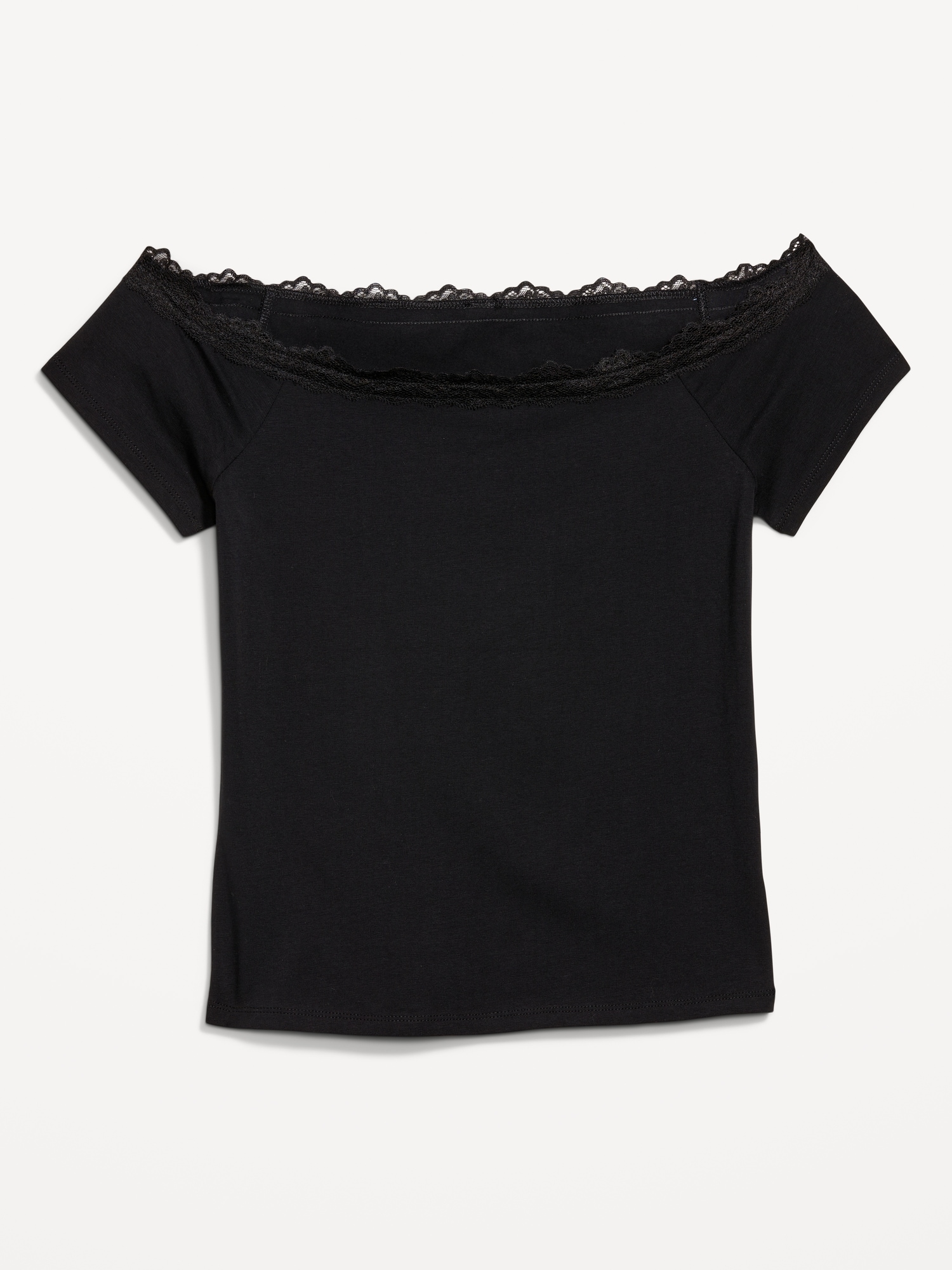 Off-Shoulder Lace-Trim Top: off-shoulder neckline, lace trim, short sleeves, #801545