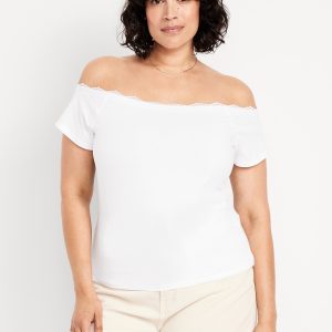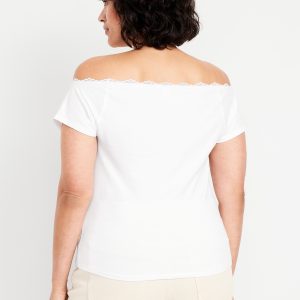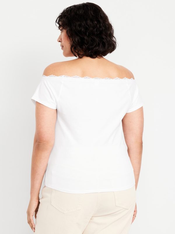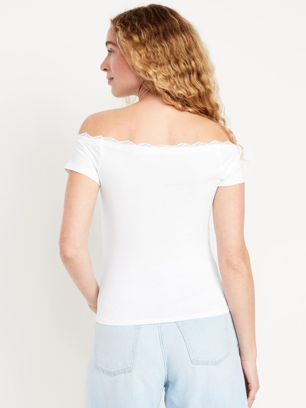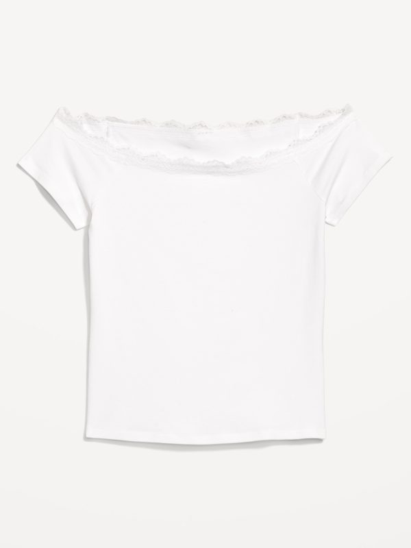 Off-Shoulder Lace-Trim Top: off-shoulder neckline, lace trim, short sleeves, #801545