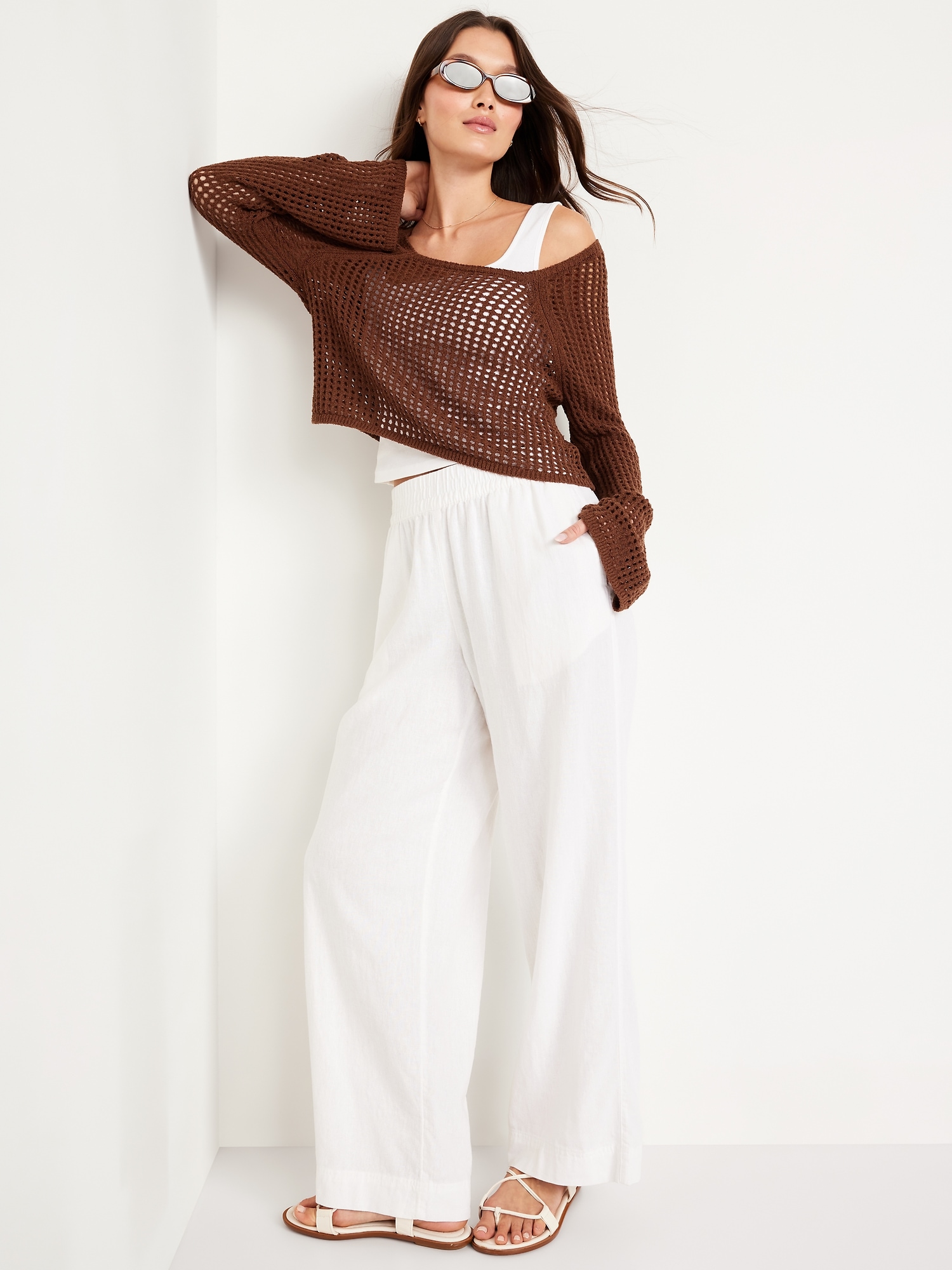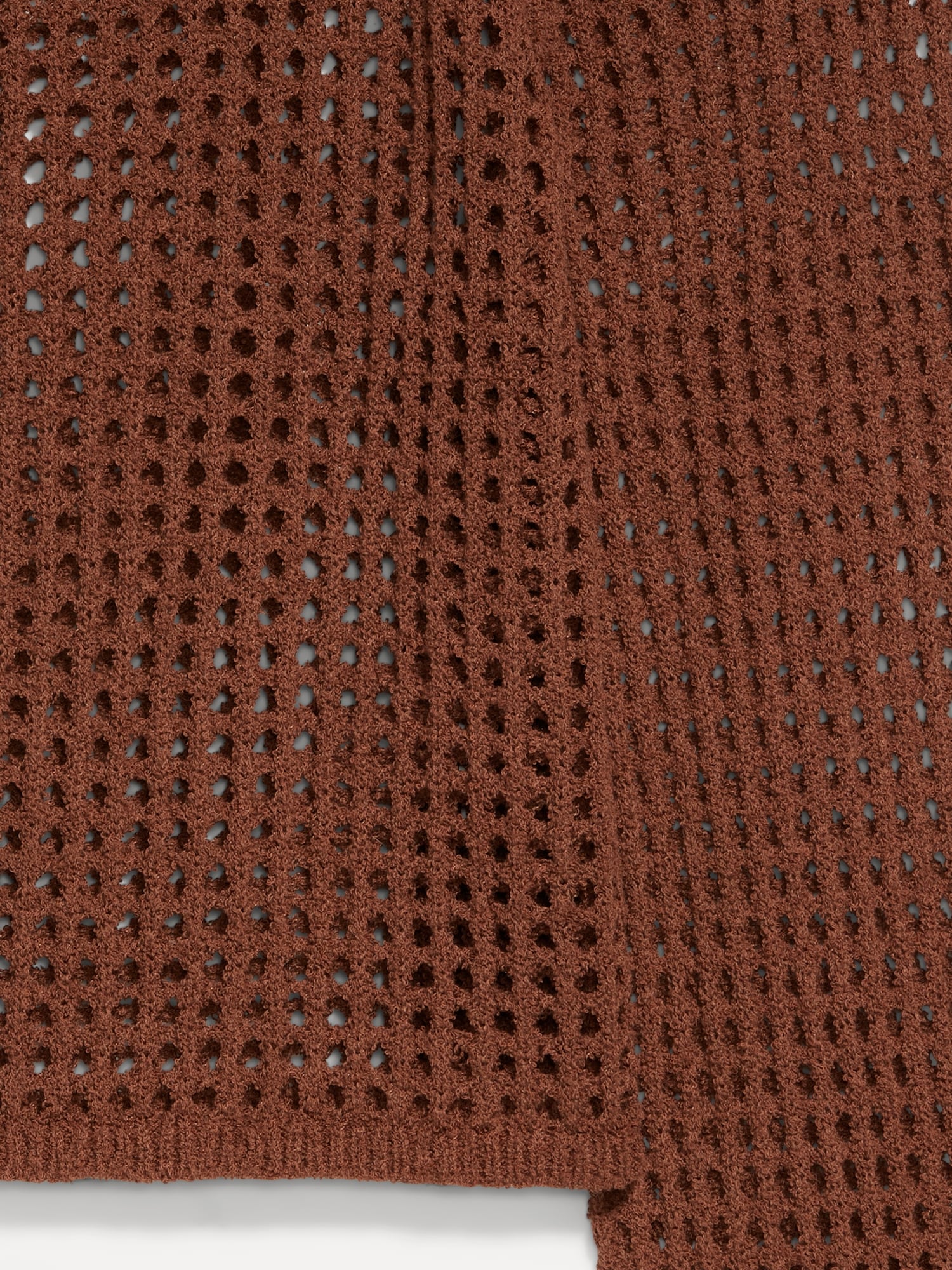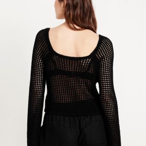 Open-Stitch Cropped Bouclé Sweater: square neck, long sleeves, great for layering, #664078