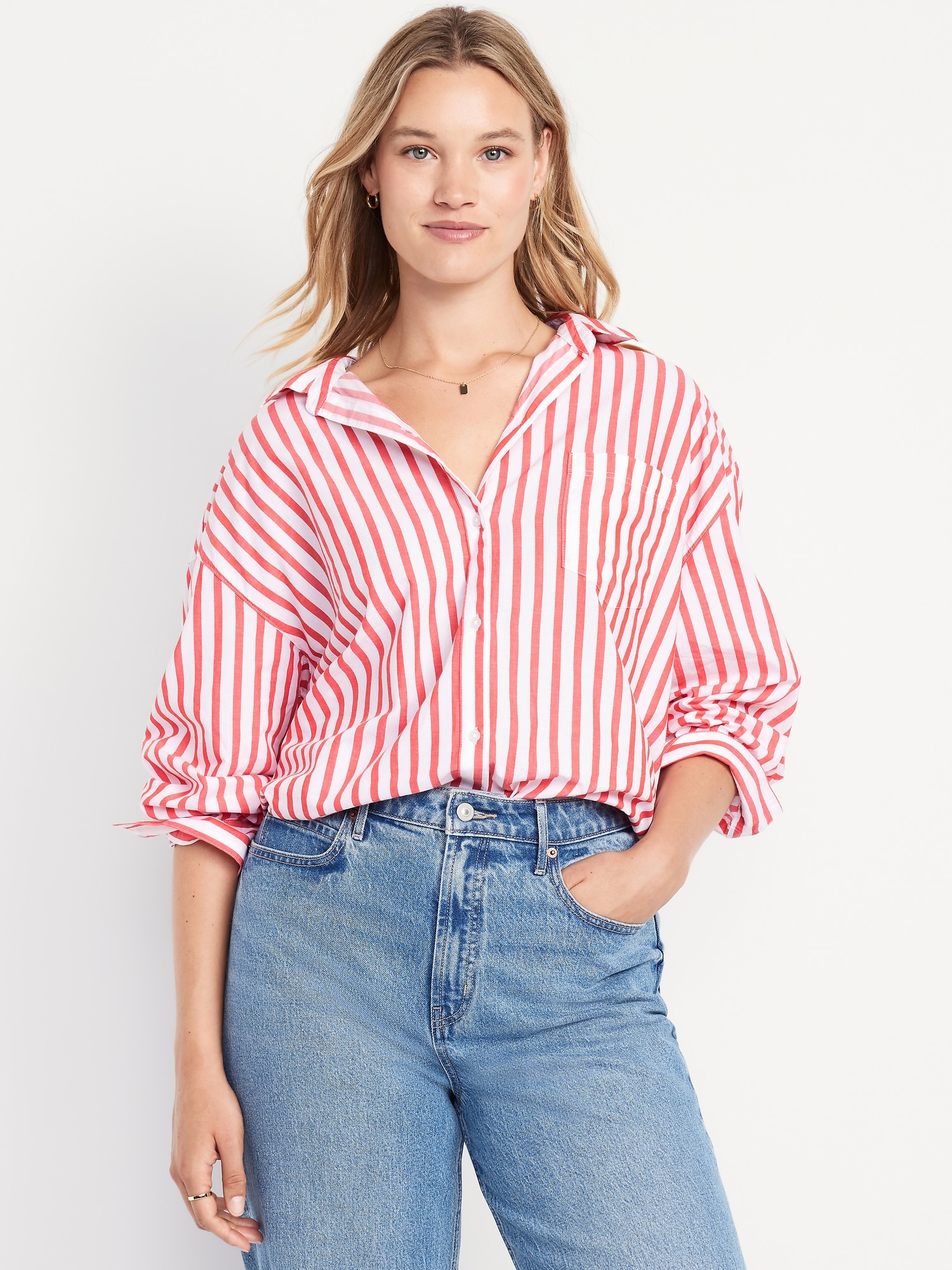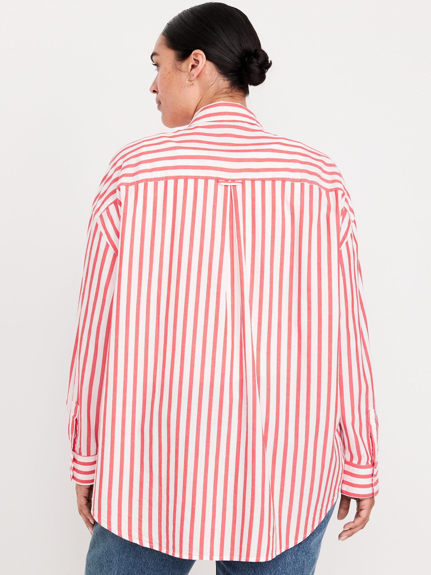 Oversized Button-Down Boyfriend Shirt: spread collar, long sleeves with buttoned cuffs, full-button front, patch chest pocket, curved hem, vertical stripes, #798437