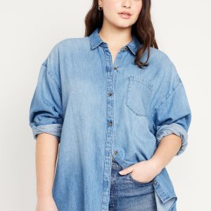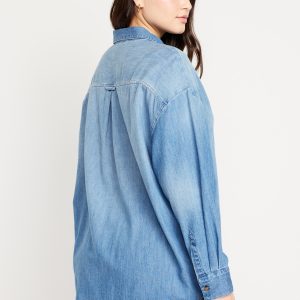 Oversized Button-Down Boyfriend Shirt: spread collar, long sleeves with buttoned cuffs, full-button front, patch chest pocket, curved hem, vertical stripes, #798437