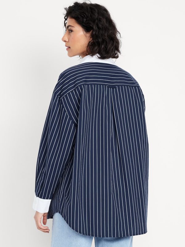 Oversized Button-Down Boyfriend Shirt: spread collar, long sleeves with buttoned cuffs, full-button front, patch chest pocket, curved hem, vertical stripes, #798437