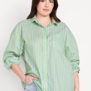 Oversized Button-Down Boyfriend Shirt: spread collar, long sleeves with buttoned cuffs, full-button front, patch chest pocket, curved hem, vertical stripes, #798437