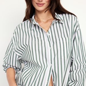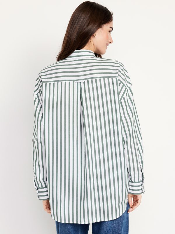 Oversized Button-Down Boyfriend Shirt: spread collar, long sleeves with buttoned cuffs, full-button front, patch chest pocket, curved hem, vertical stripes, #798437