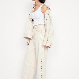 Oversized Jean Trucker Jacket: studded accents, spread collar, long sleeves with buttoned cuffs, full-button front, button-flap chest pockets, vertical welt pockets, #790495