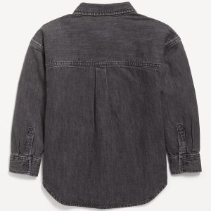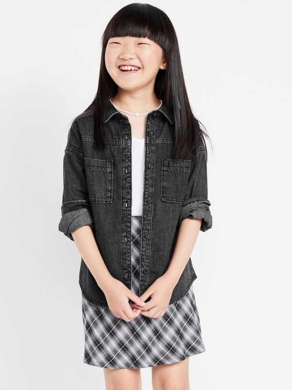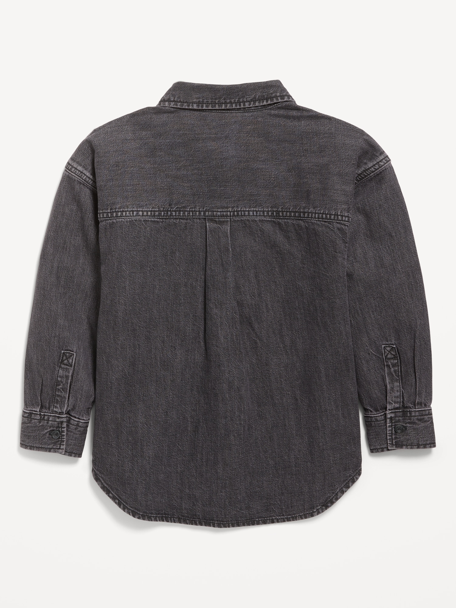 Oversized Pocket Jean Top for Girls: spread collar, long sleeves, drop shoulders, buttoned cuffs, patch pockets at chest, full length buttoned placket, round hem, all-over star print, #806101