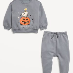 Peanuts™ Snoopy Graphic Sweatshirt and Pants Set for Baby: crew neck, long sleeves, drop shoulders, banded cuffs and hem, coordinating bottoms, elasticized waistband, functional drawstring, licensed graphic, © 2025 Peanuts Worldwide LLC, #803621