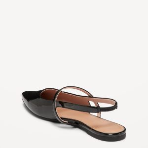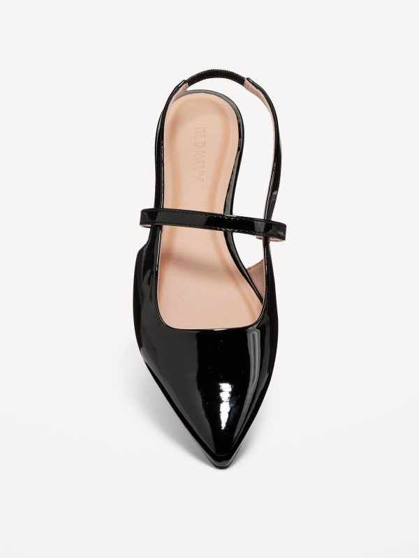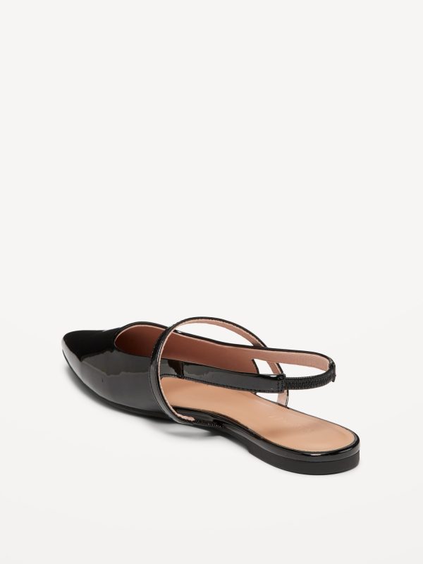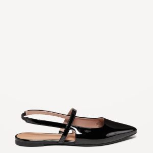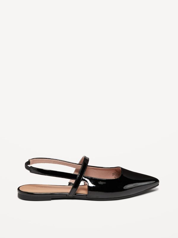 Pointed Toe Slingback Flats: pointed toe, elastic ankle strap, strap across foot, firm foot bed, textured outsole, available in patent leather and metallic styles, #605167