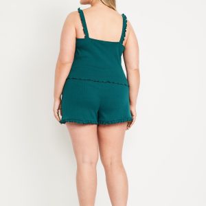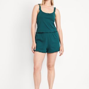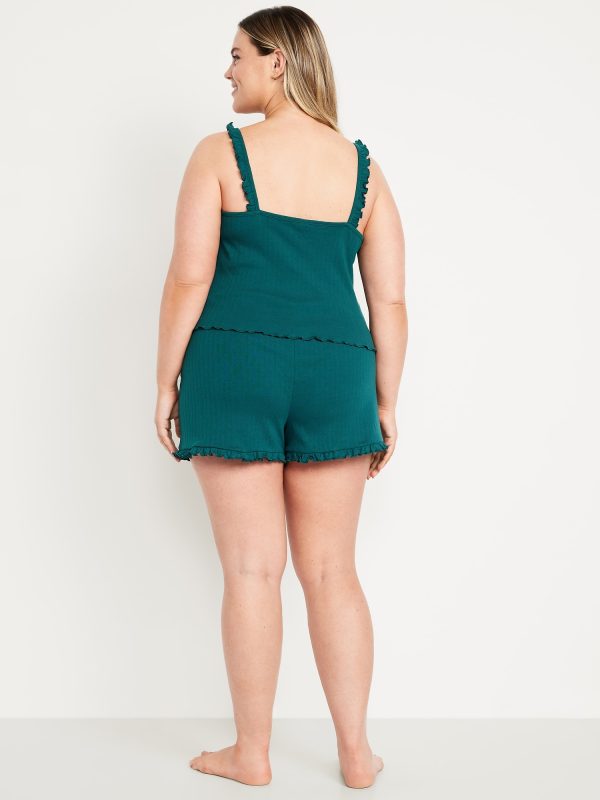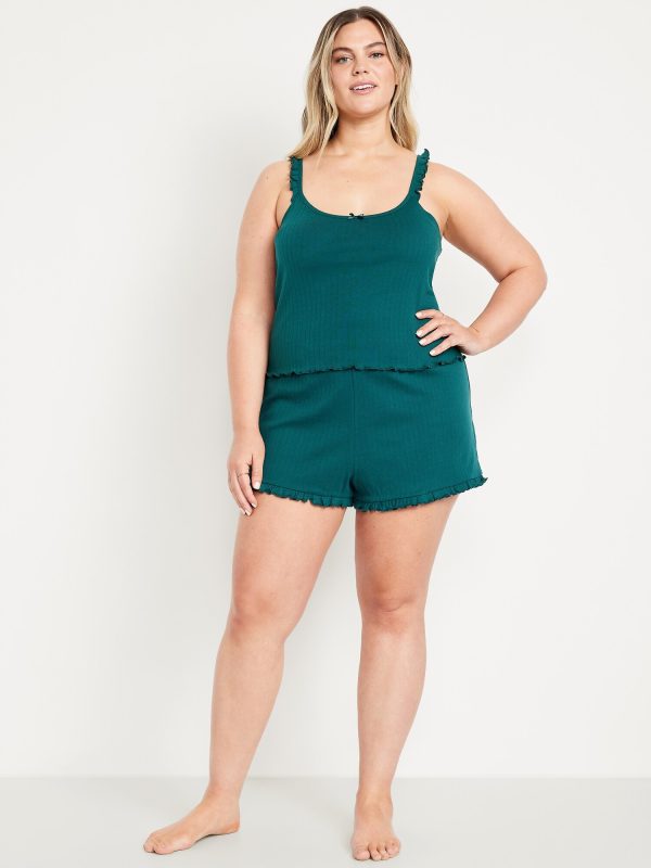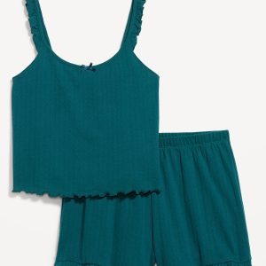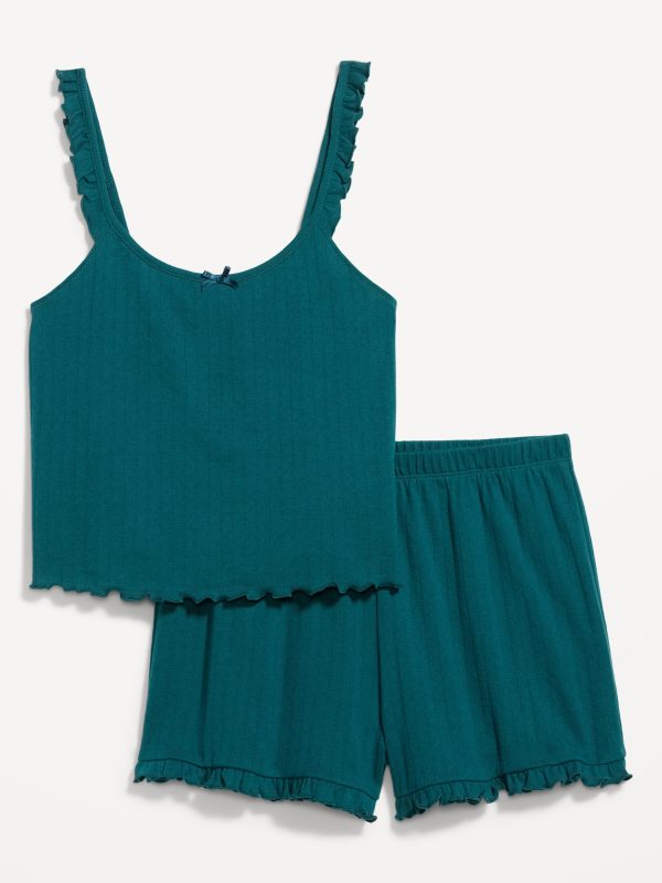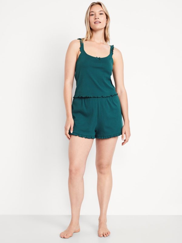 Pointelle Pajama Short Set: set includes cami sleep top and matching shorts, scoop neck with bow accent, ruffled straps, elastic-waist shorts with ruffled hem, #808329