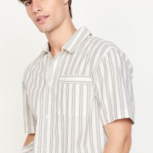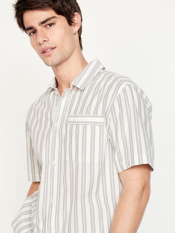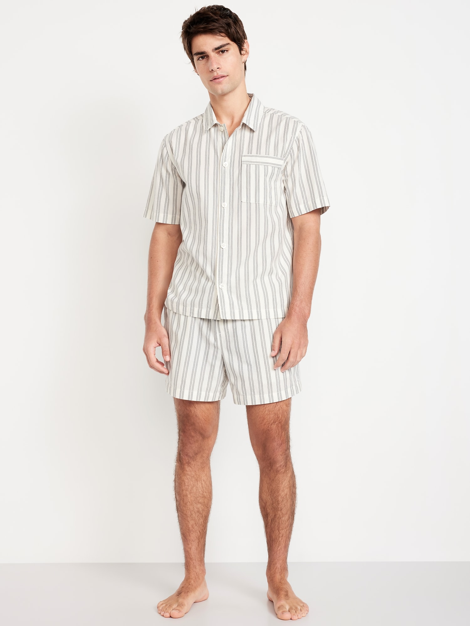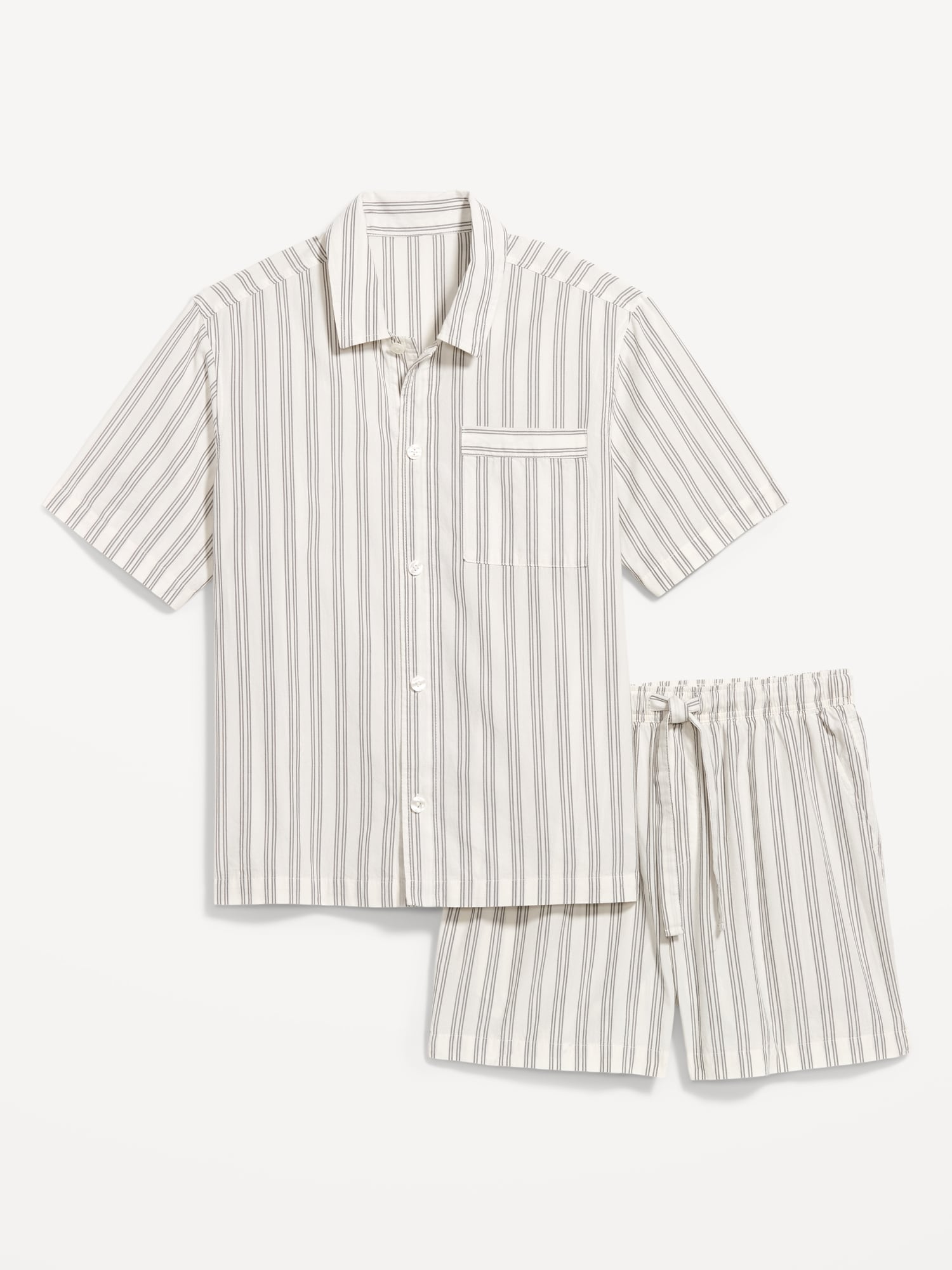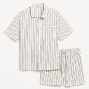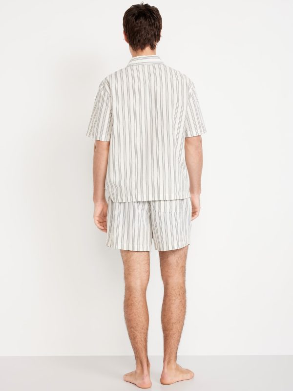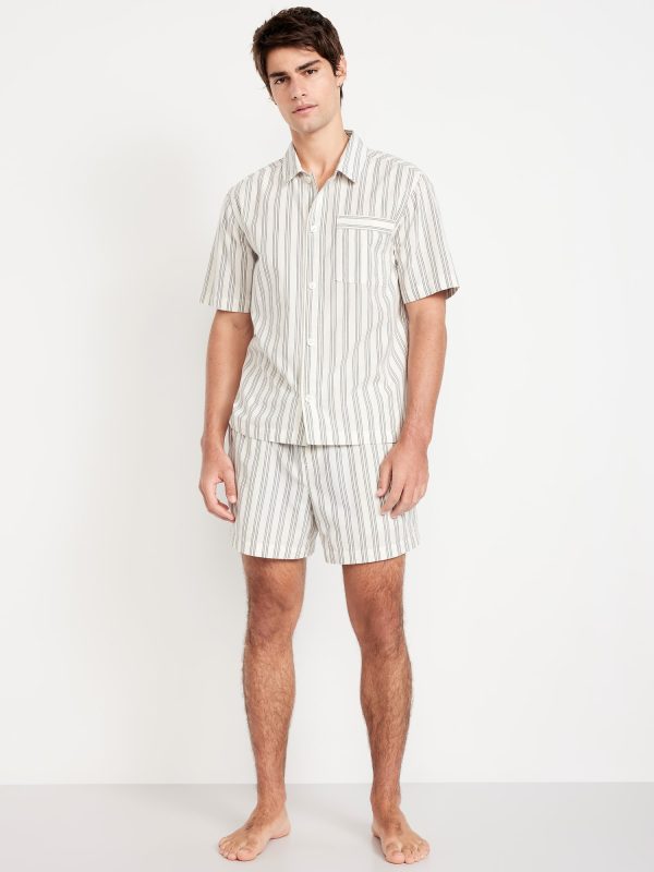 Poplin Pajama Short Set: set includes poplin pajama shirt and matching shorts, notched collar, short sleeves, full-button front, patch chest pocket, elastic-waist shorts with front pockets and back patch pocket, striped print, #764001