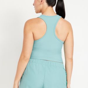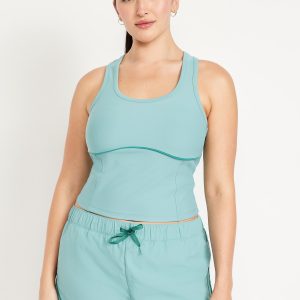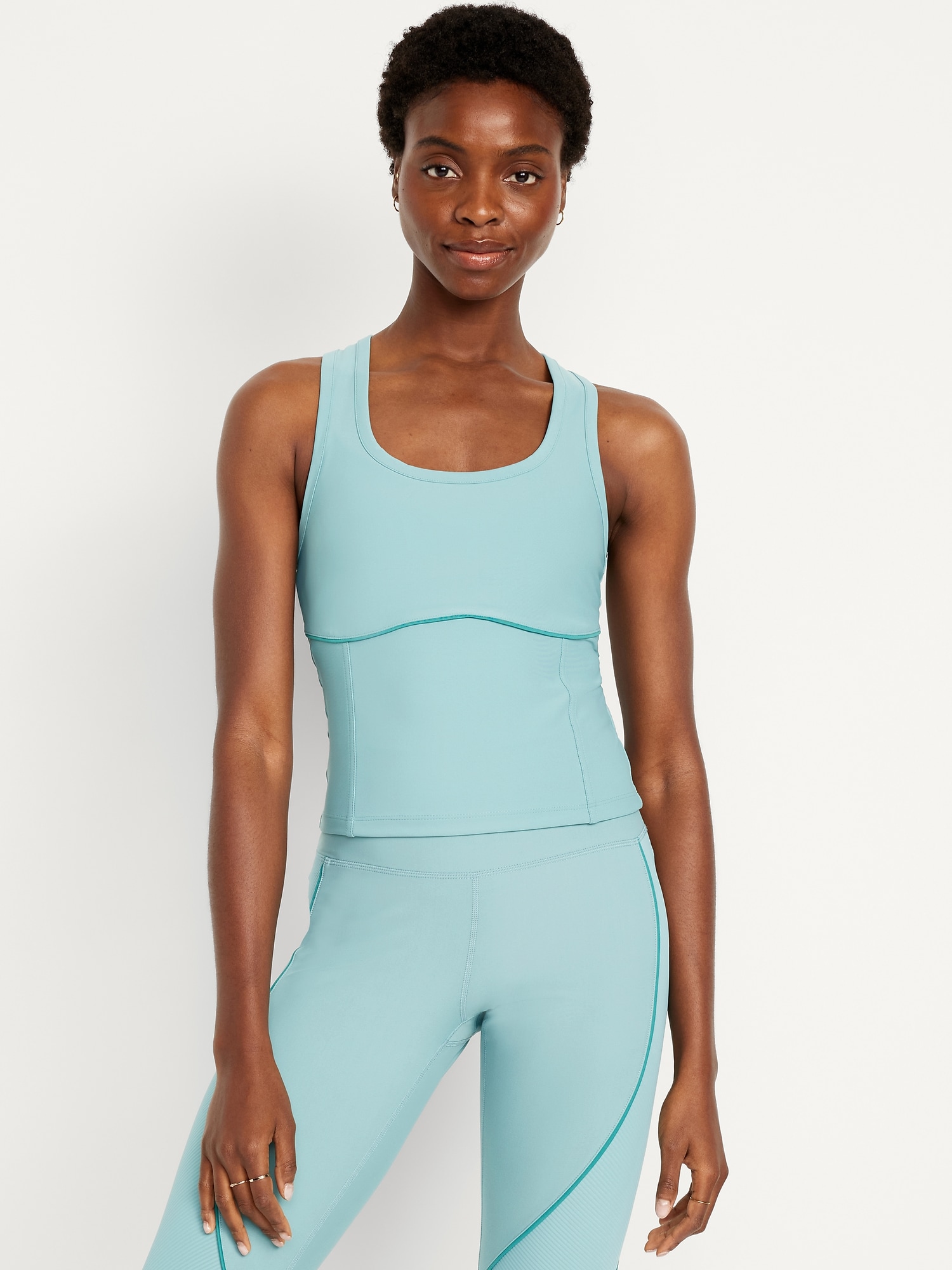 PowerSoft Racerback Cropped Shell Tank: Featuring PowerSoft. Light compression meets a peachy-smooth, sweat-wicking fabric.scoop neck, wide straps, racerback, contrasting piping, go-dry wicks moisture, #749263