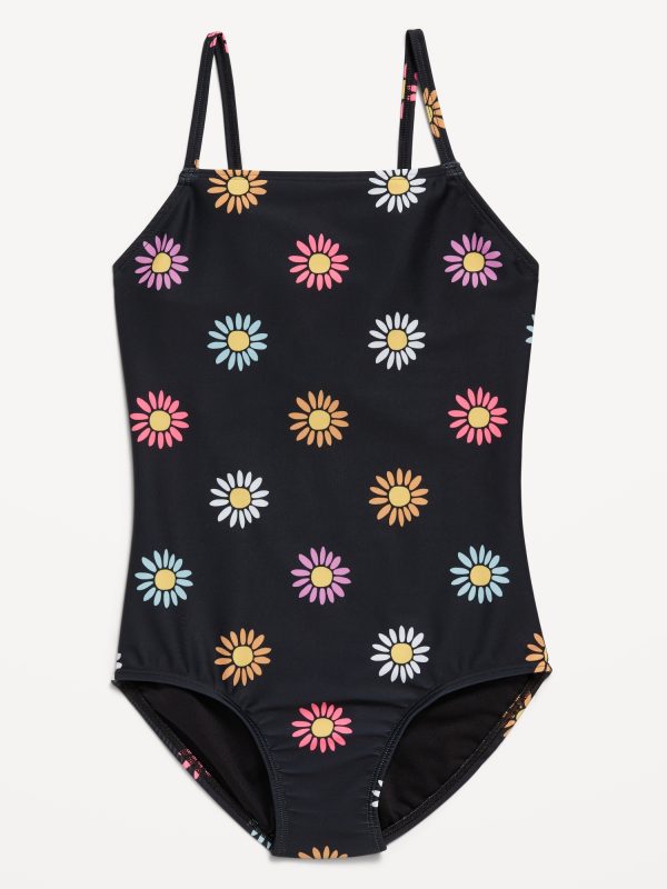 Printed Back Cutout One-Piece Swimsuit for Girls: square neckline, adjustable straps, deep cutout at back, all-over print, #660299