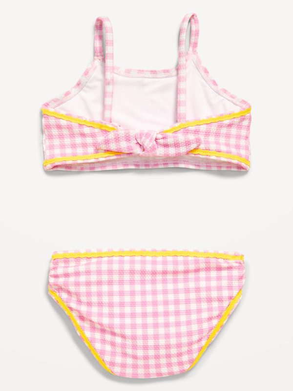 Printed Bikini Swim Set for Toddler & Baby: rounded neckline, thin straps, decorative crossover tie at back, matching bikini swim bottoms, all-over print, contrasting zig zag trim, #762436