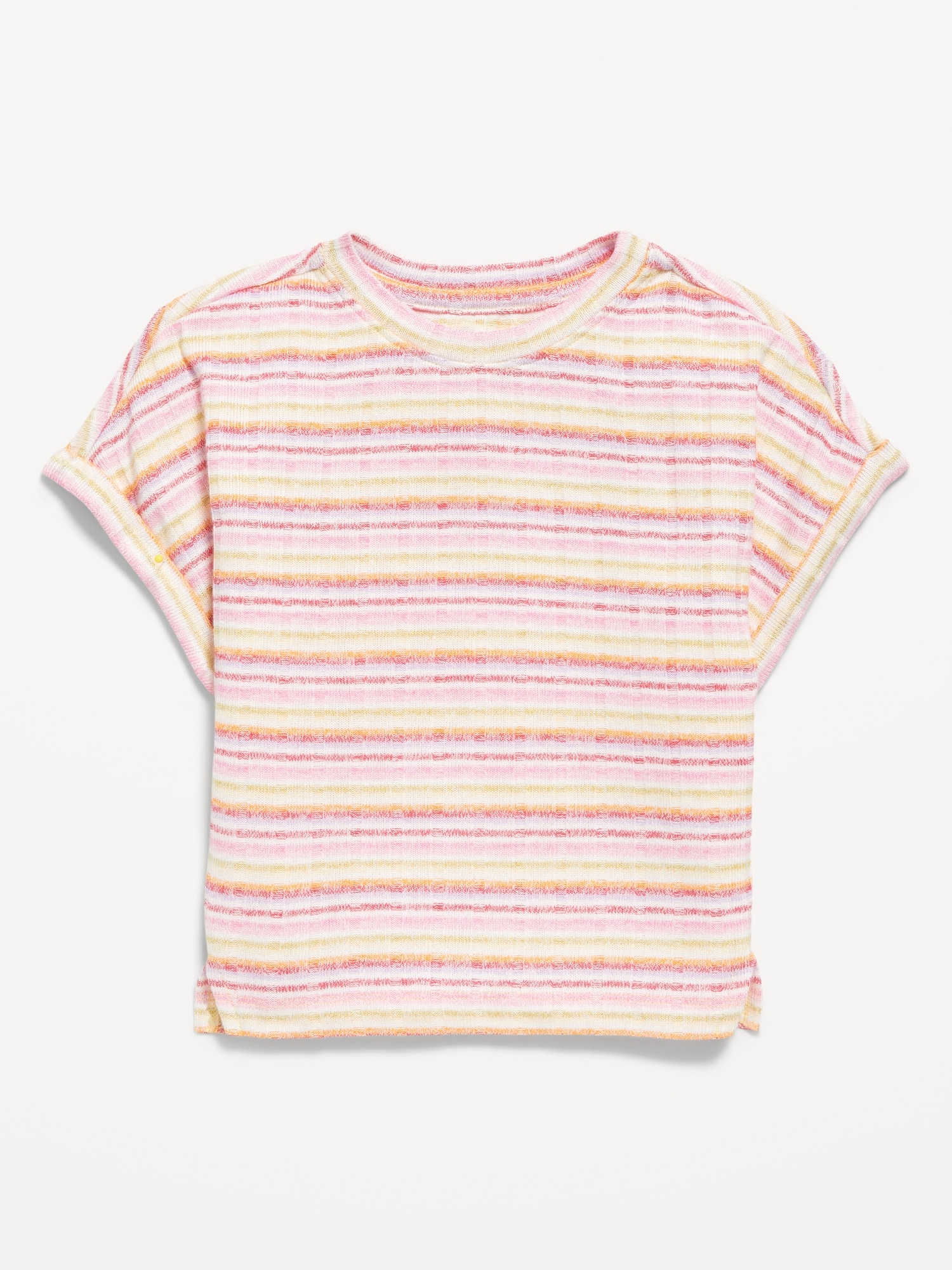 Printed Dolman-Sleeve Rib-Knit T-Shirt for Toddler Girls: crew neck, short rolled dolman sleeves, forward side slits at hem, all-over print, #762285