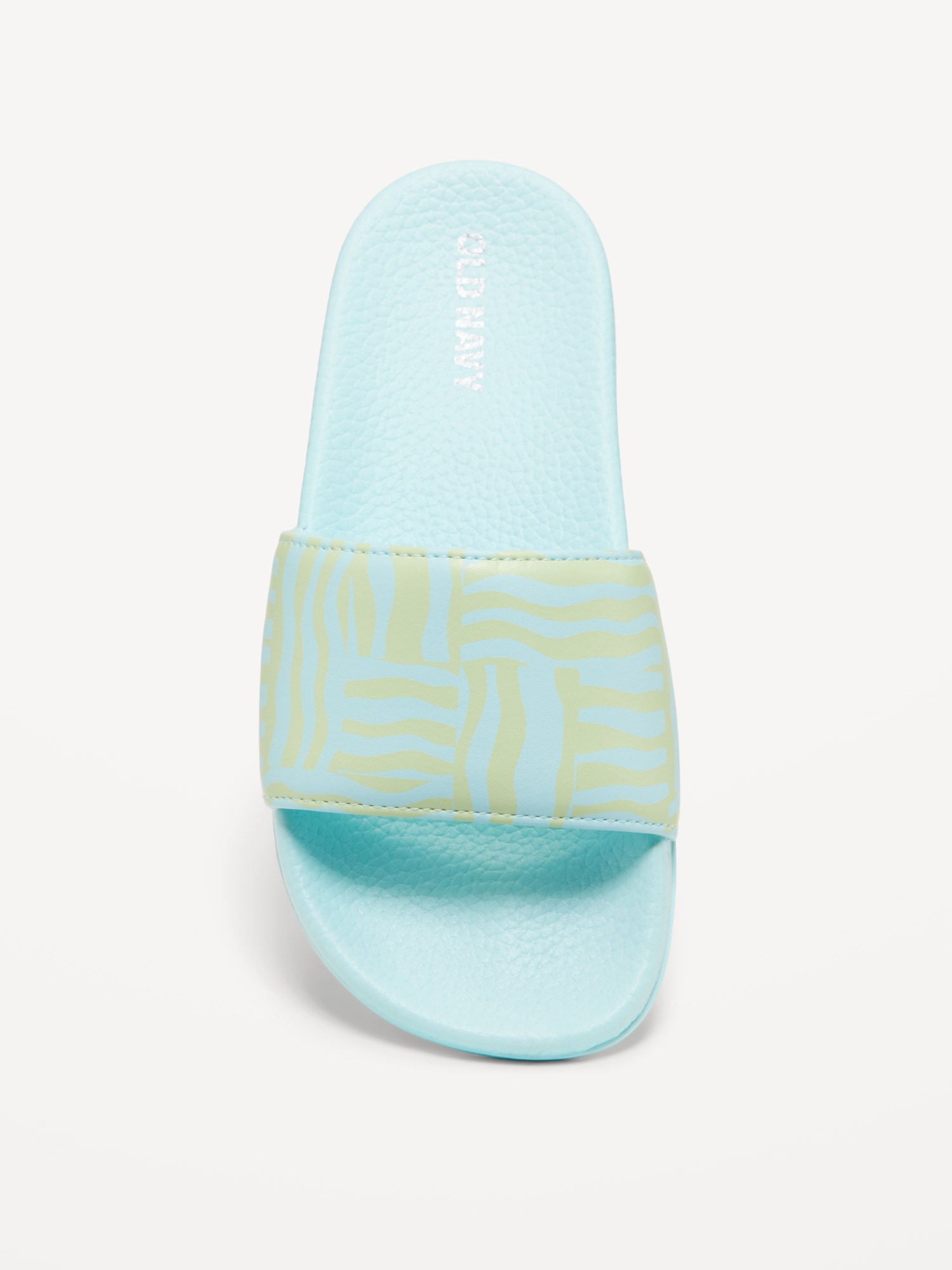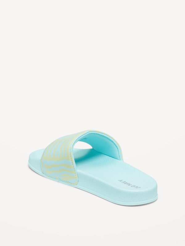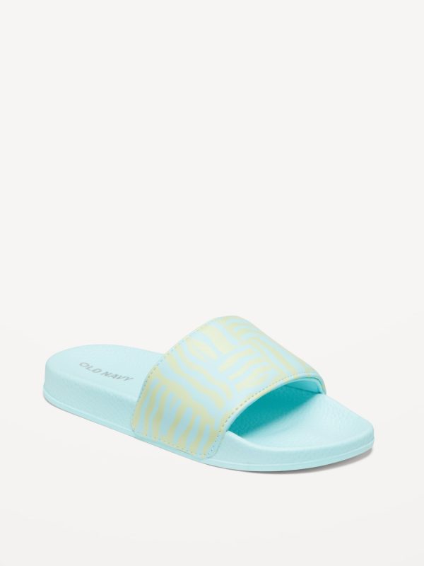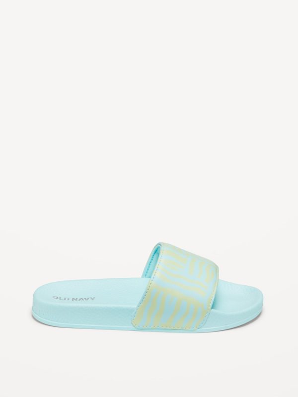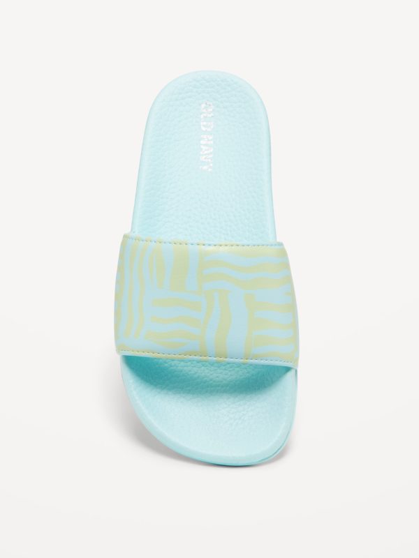 Printed Faux-Leather Pool Slide Sandals for Girls: wide-strap, contoured faux-leather foot bed, all-over print at strap, textured outsole, easy slide-on style, #693391