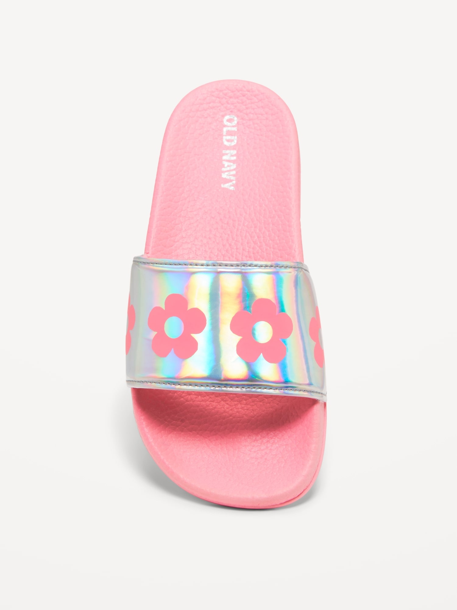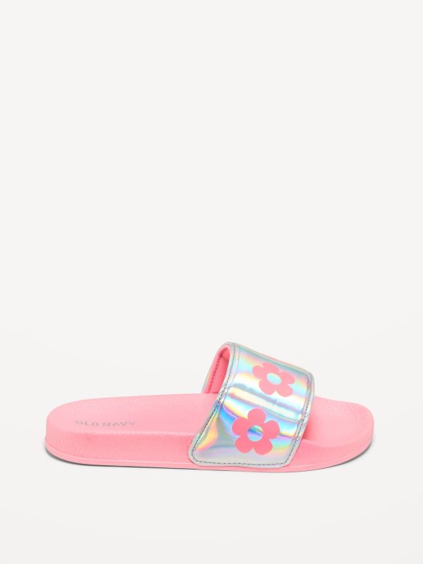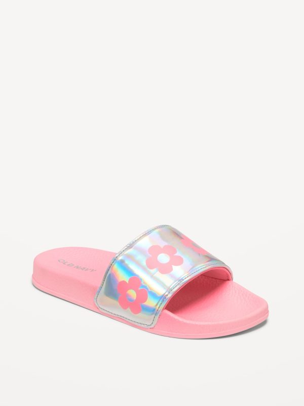 Printed Faux-Leather Pool Slide Sandals for Girls: wide-strap, contoured faux-leather foot bed, all-over print at strap, textured outsole, easy slide-on style, #693391