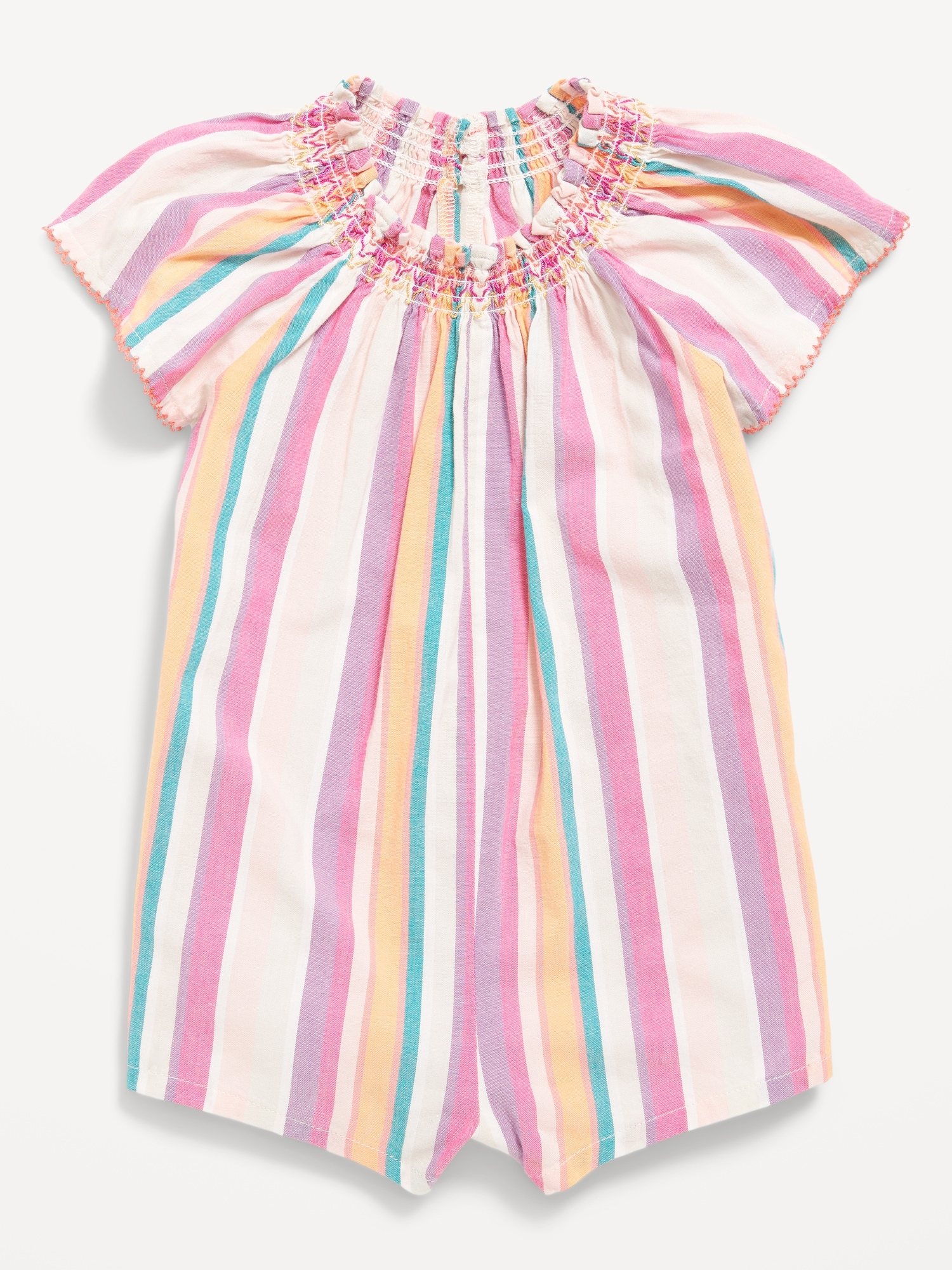 Printed Flutter-Sleeve One-Piece Romper for Baby: smocked neckline, short flutter sleeves, hidden snaps along inseam, all-over print, #761816