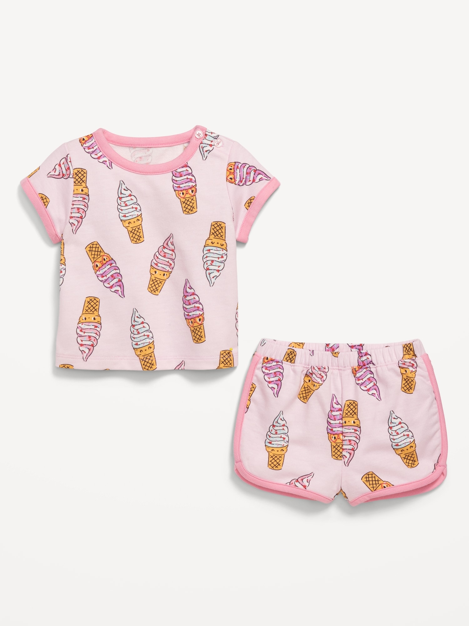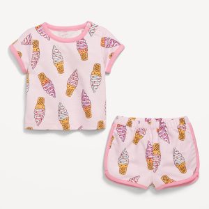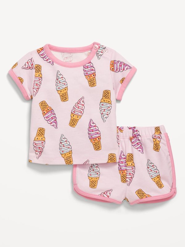 Printed French-Terry Ringer T-Shirt and Shorts Set for Baby: crew neck with buttons at shoulder, dolman sleeves, front graphic, functional elastic-drawstring waist shorts, available exclusively online and at old navy outlets, #766737