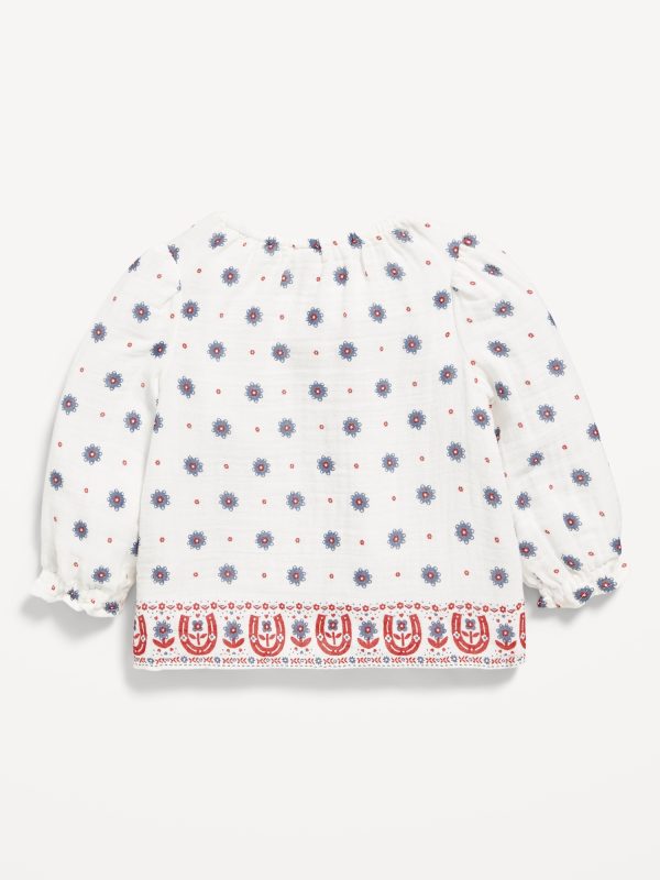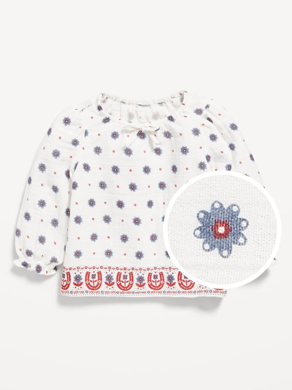 Printed Long-Sleeve Double-Weave Top for Baby: round cinched neckline, decorative bow at neck, long puffy sleeves, embroidered flowers at hem, #802098