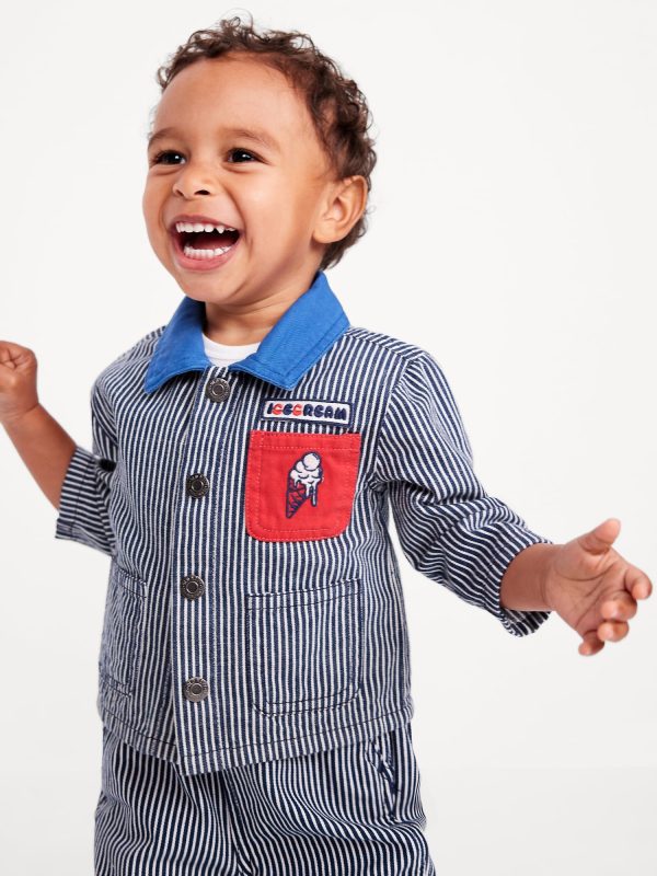 Printed Loose Collared Twill Jacket for Baby: pointed collar, long sleeves, full length button front, embroidered patch pocket at chest, pockets at hem, all-over stripes, #688352