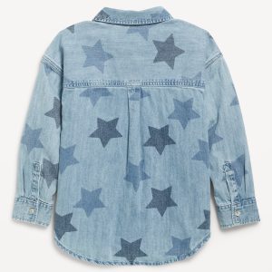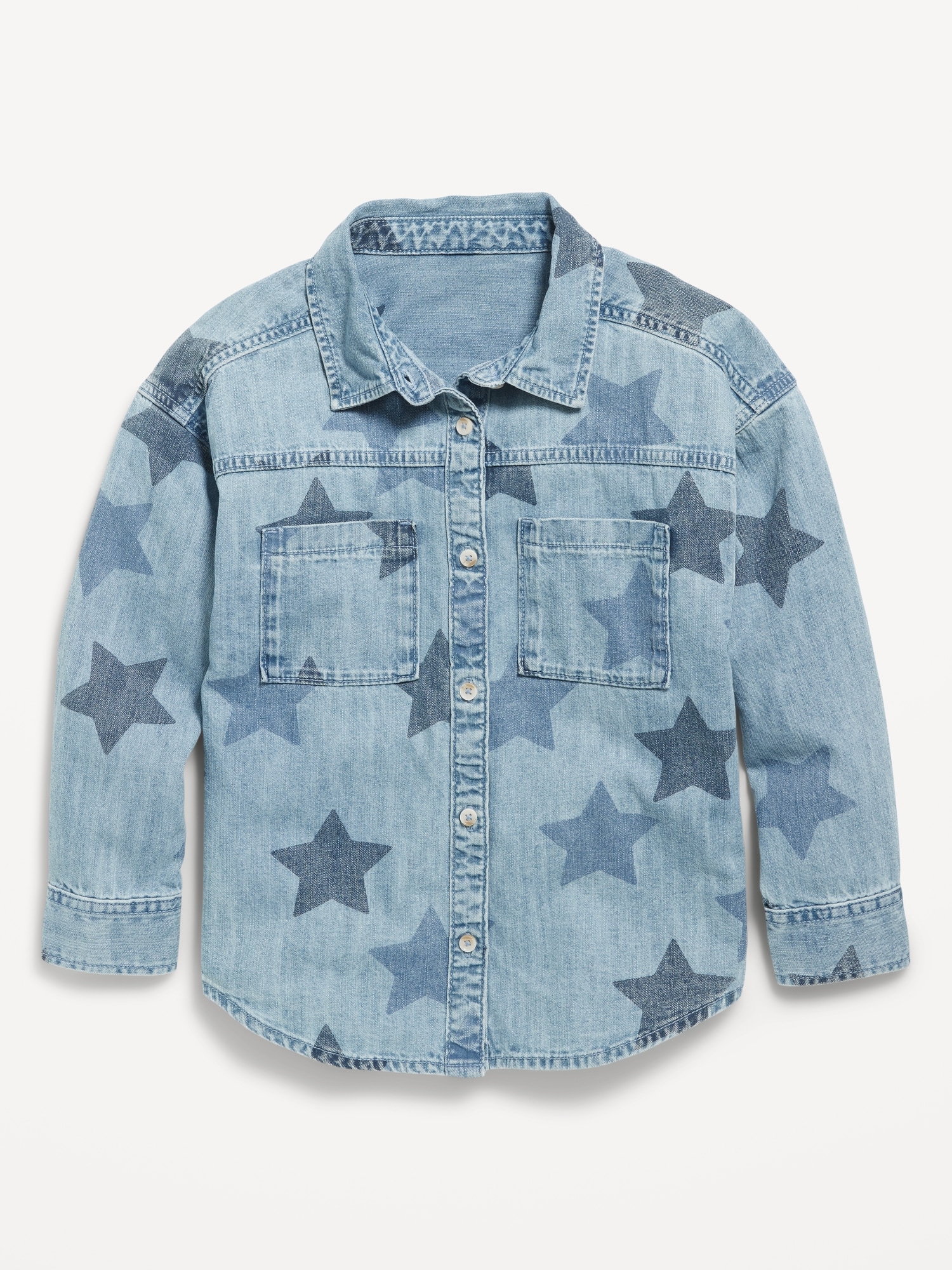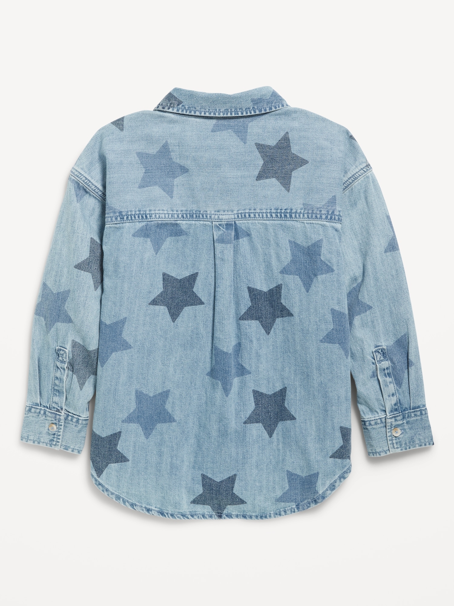 Printed Oversized Pocket Jean Top for Girls: spread collar, long sleeves, drop shoulders, buttoned cuffs, patch pockets at chest, full length buttoned placket, round hem, all-over star print, #806101