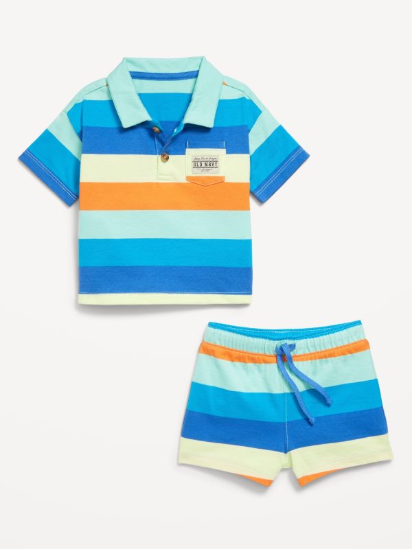 Printed Polo Shirt and Shorts Set for Baby: spread collar, two-button placket, short sleeves, drop shoulders, patch pocket at chest, small-scale embroidered logo patch at pocket, matching shorts, elasticized waistband, functional drawstring, all-over wide stripes, #761912