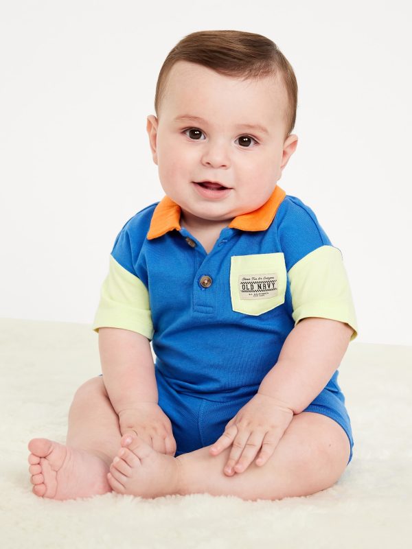 Printed Polo Shirt and Shorts Set for Baby: spread collar, two-button placket, short sleeves, drop shoulders, patch pocket at chest, small-scale embroidered logo patch at pocket, matching shorts, elasticized waistband, functional drawstring, all-over wide stripes, #761912