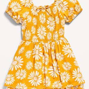 Printed Puff-Sleeve Smocked Dress for Girls: ruffled square neckline, short puff sleeves, smocked back, seamed waist, flowy skirt, built-in shorts, layered look at bottom, all-over print, #766638