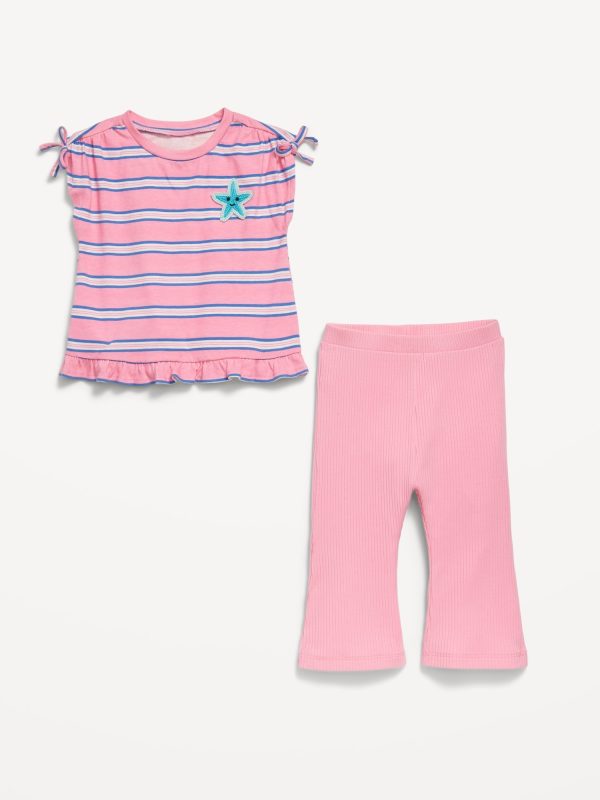 Printed Ruffle-Trim Top and Ribbed Flare Leggings Set for Baby: crew neck, sleeveless, tie-knots at shoulder, ruffled hem, all-over print or graphic at front, coordinating leggings, elasticized waistband, flare leg, #761827