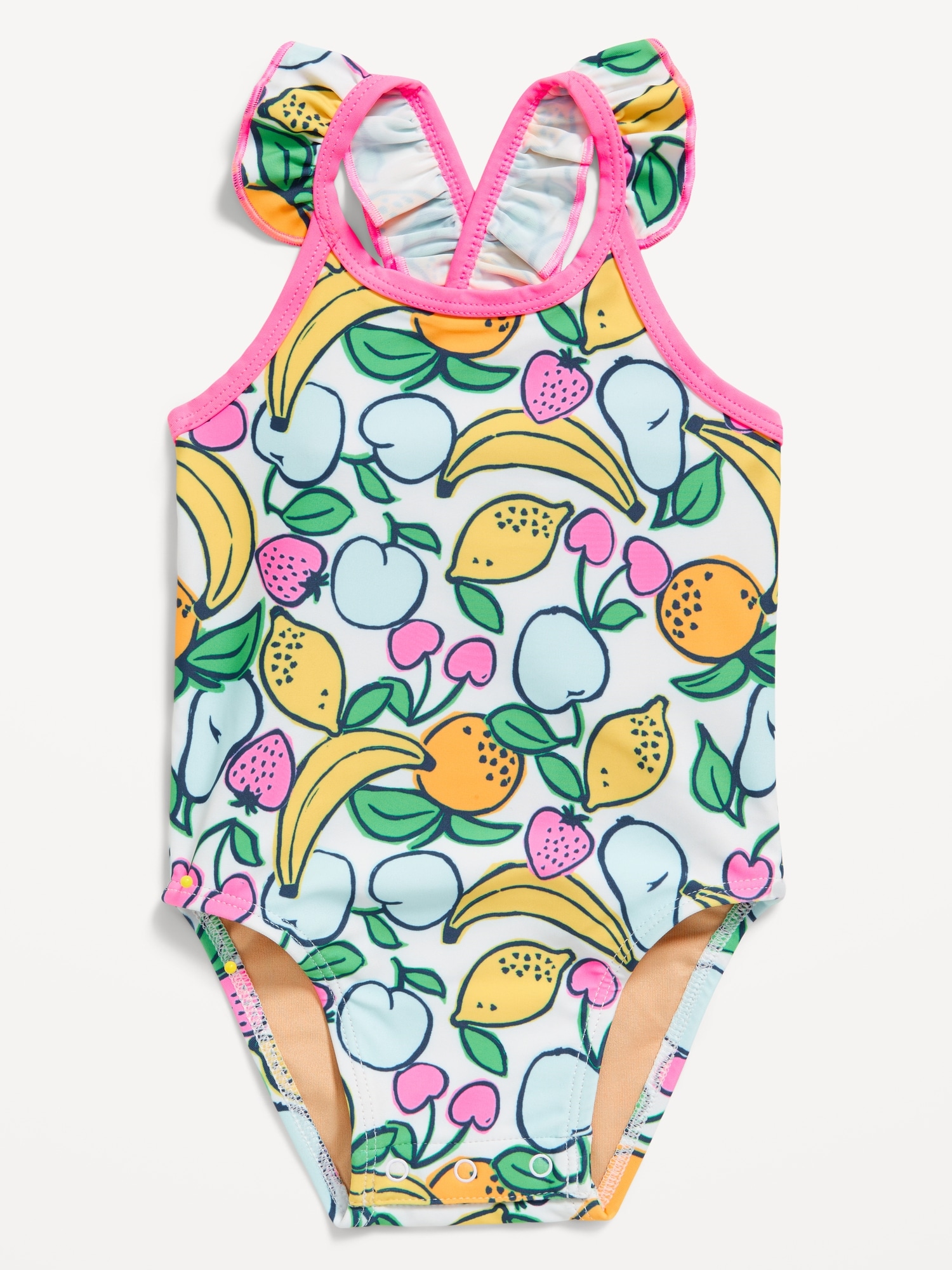 Printed Ruffled One-Piece Swimsuit for Baby: scoop neckline, ruffle trim straps cross at back, snaps at inseam, all-over pattern or print, #693848