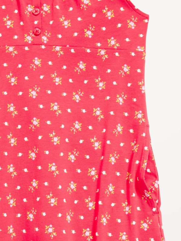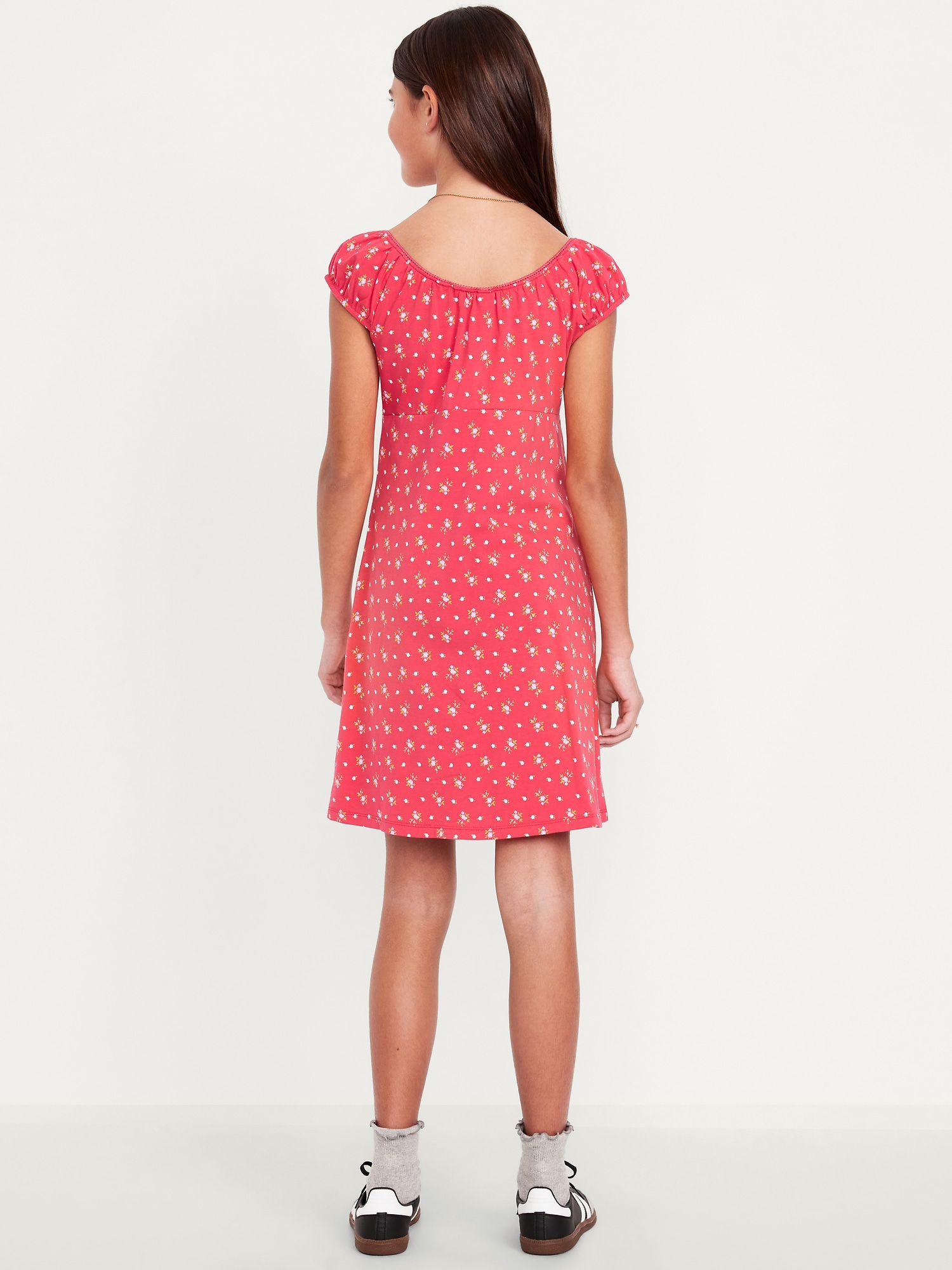 Printed Short-Sleeve Henley Dress for Girls: round neckline, elasticized cap sleeves, three-button henley placket, seamed waist, all-over print, #766644