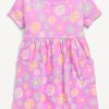 Printed Short-Sleeve Utility Twill Romper for Toddler Girls: spread collar, short sleeves, utility patch pockets at chest, full length buttoned placket, side utility patch pockets, cinched center back, hidden snaps along inseam, all-over print, #767016
