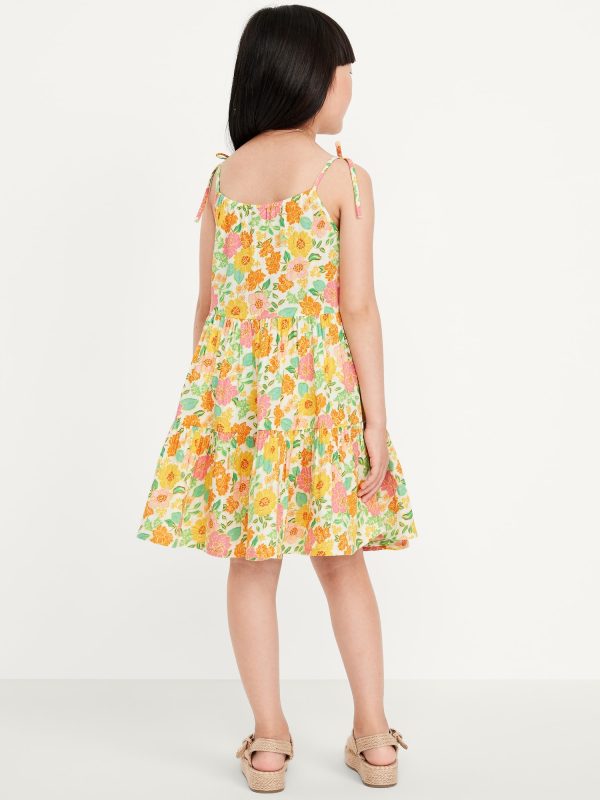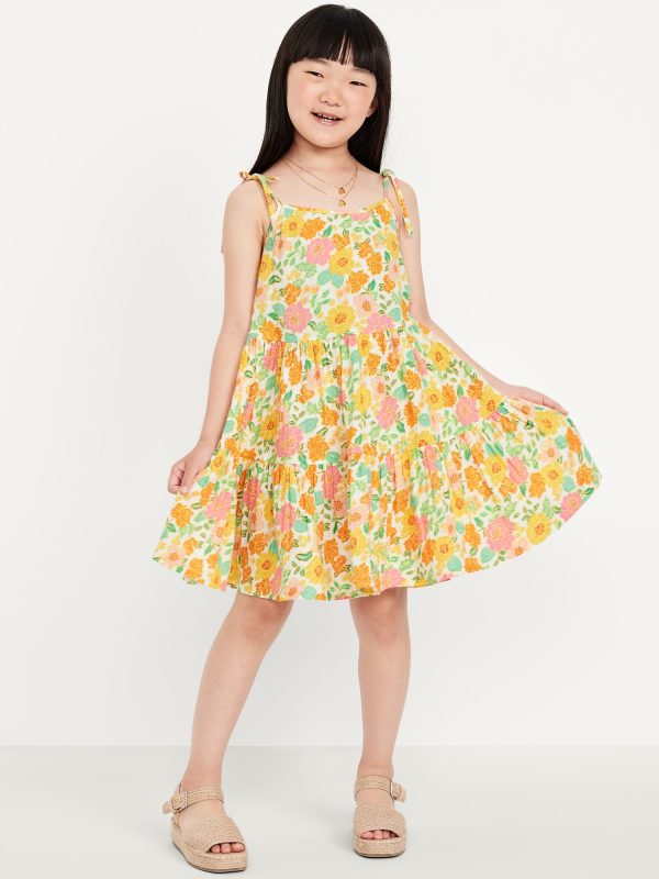 Printed Sleeveless Double-Weave Tiered Dress for Girls: square neckline, thin shoulder straps with tie-bows, tiered, all-over print, #766693