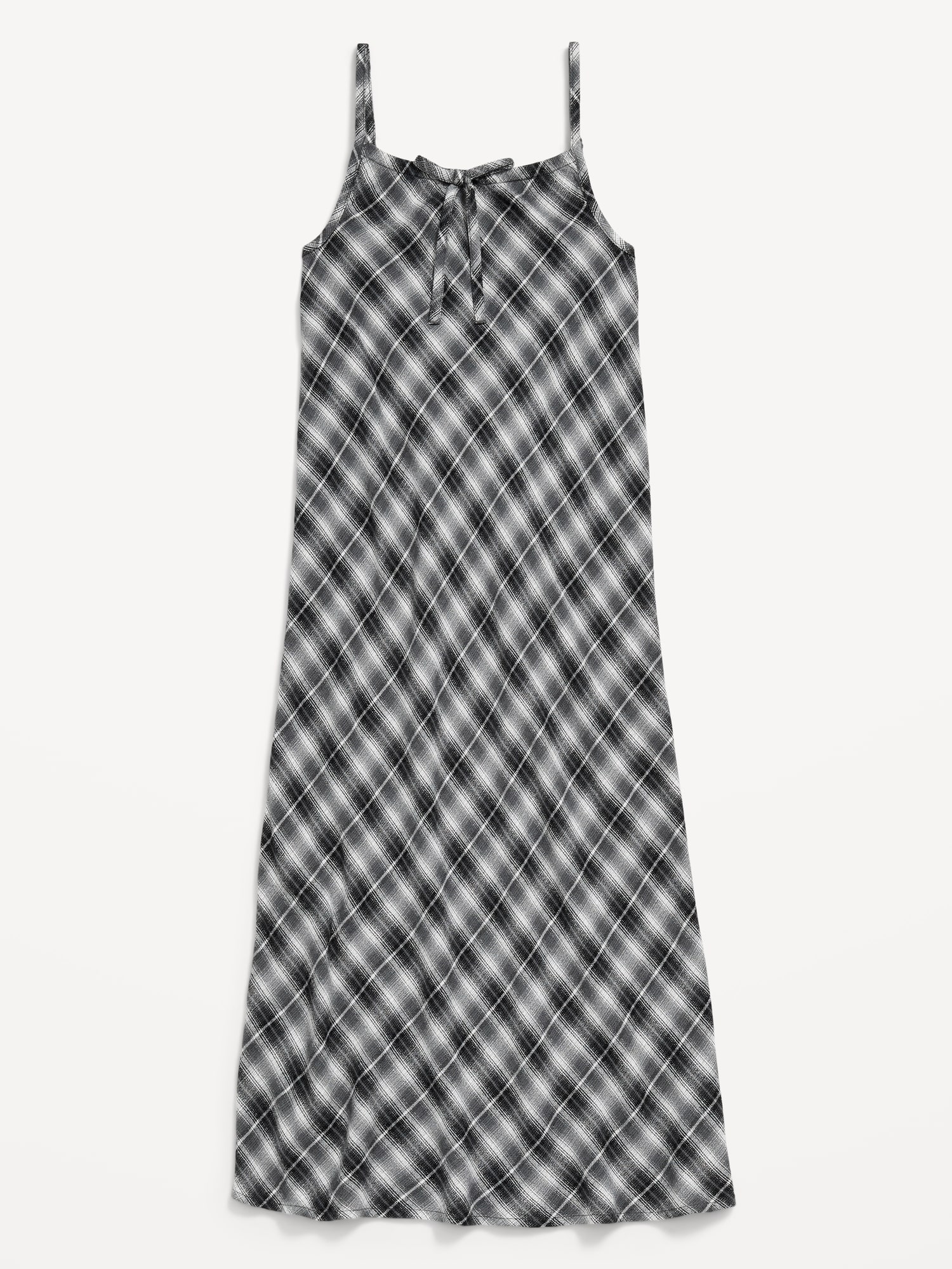 Printed Sleeveless Fit and Flare Maxi Dress for Girls: square neckline, thin adjustable spaghetti straps, decorative bow at neckline, all-over print, #806132