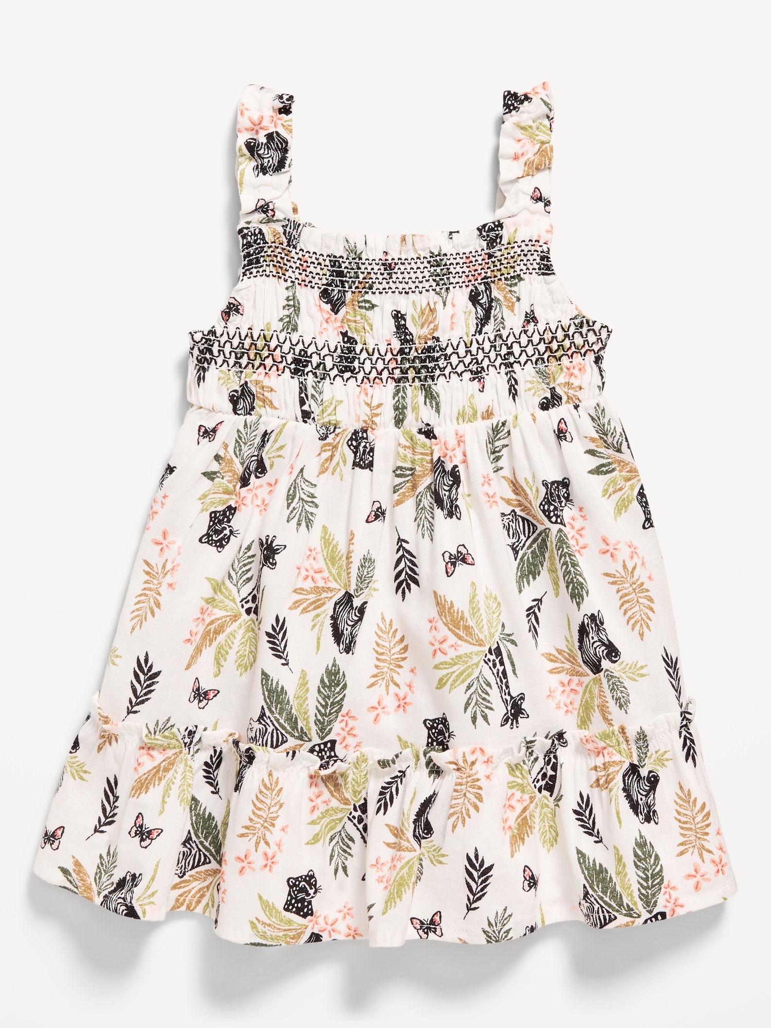 Printed Sleeveless Ruffle-Trim Smocked Dress for Baby: square neckline, sleeveless, smocking at chest, ruffle trim along neckline, shoulder straps and hem, all-over print, #761805