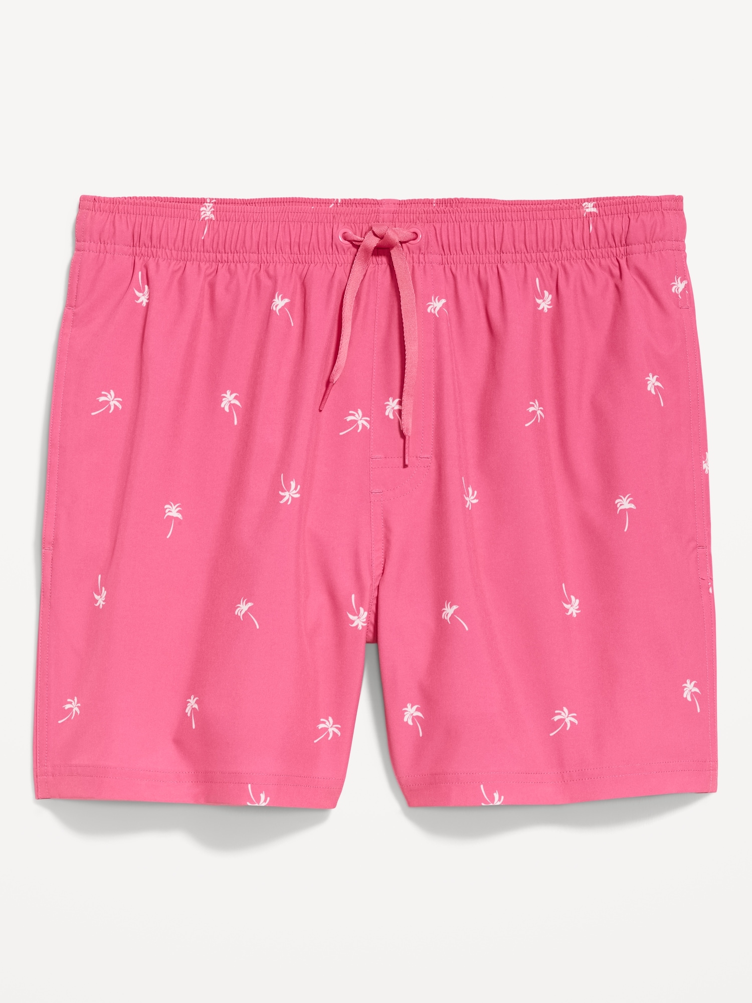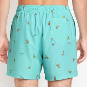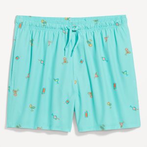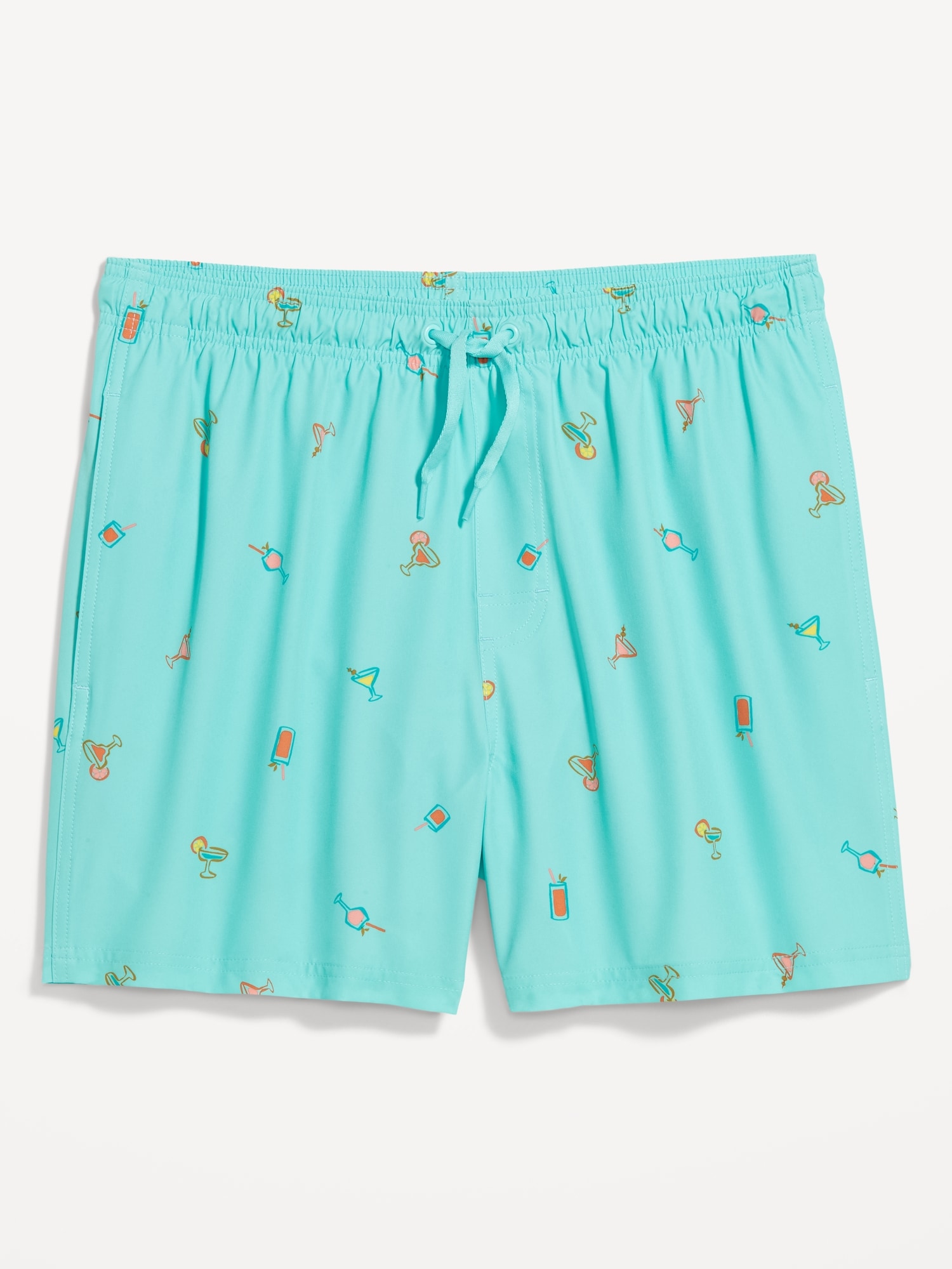 Printed Swim Trunks — 5-inch inseam: elastic-drawstring waistband, on-seam pockets, back pocket with grommet drain, built-in mesh briefs, pull-on style, all-over cocktail print, #766289