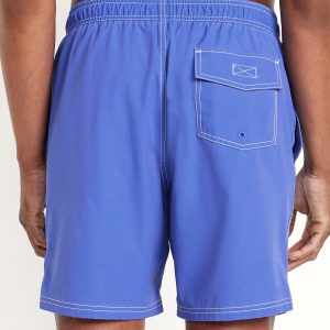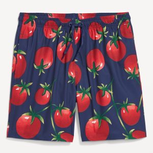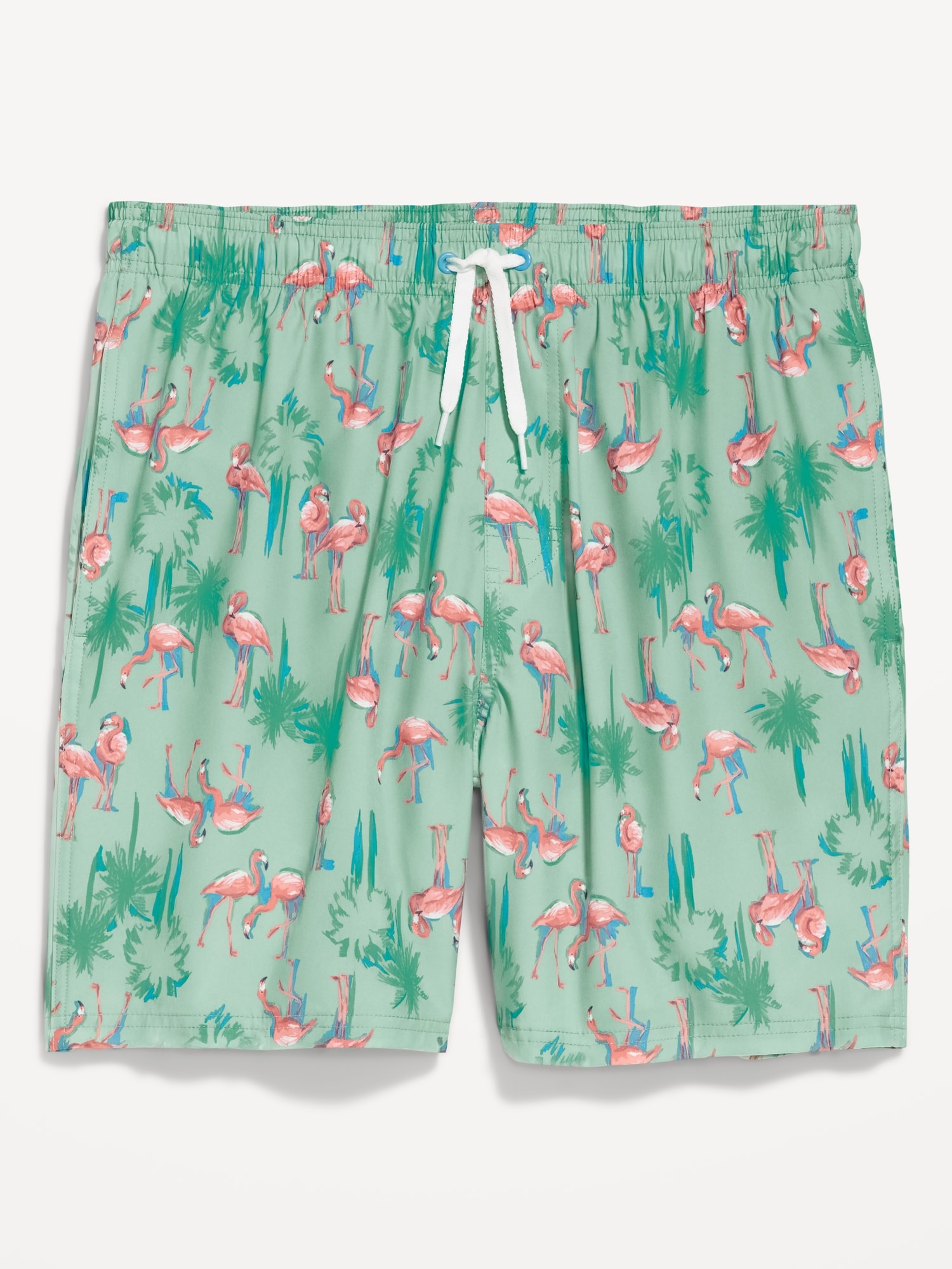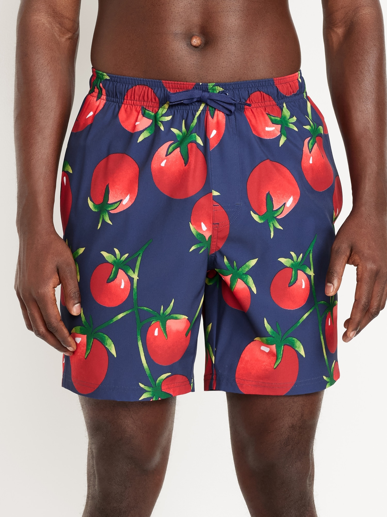 Printed Swim Trunks — 7-inch inseam: elastic-drawstring waistband, on-seam pockets, back patch pocket with grommet drain, built-in mesh briefs, pull-on style, #766290