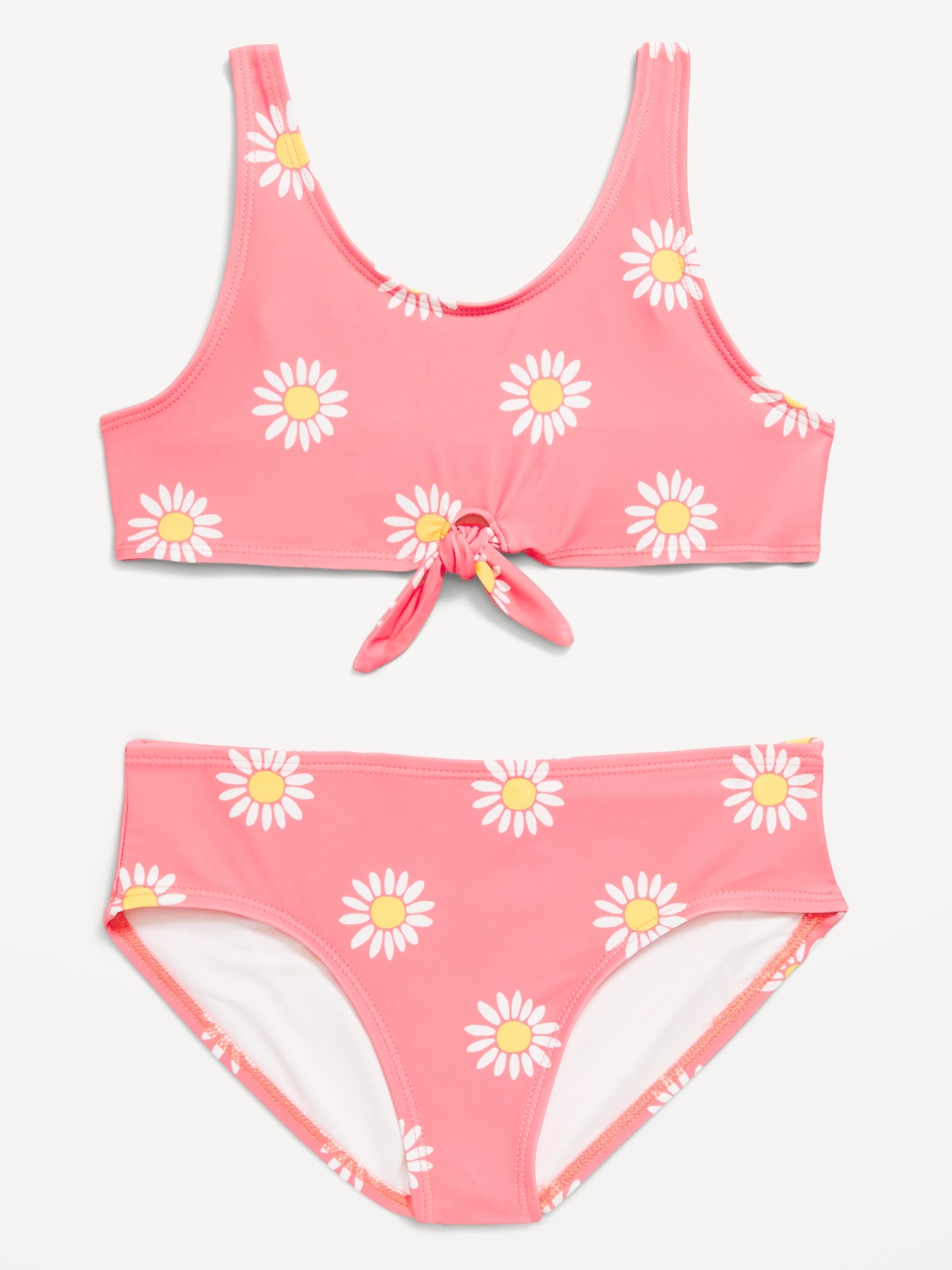 Printed Tie-Knot Bikini Swim Set for Girls: scoop neck, wide shoulder straps, tie-knot at hem, matching bikini swim bottoms, elasticized waist and leg openings, all-over print, #660307
