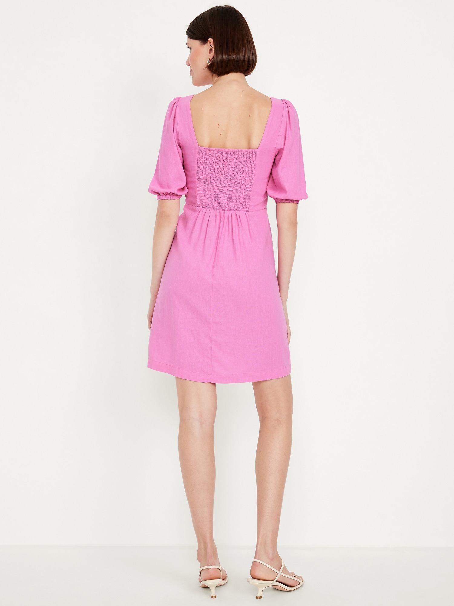 Puff-Sleeve Linen-Blend Mini Dress: square neck, short puff sleeves, elastic cuffs, full-button front, smocked back, diagonal hip pockets, seamed waist, #705712