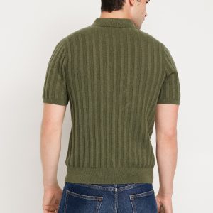 Ribbed Polo Sweater: spread collar, short sleeves, buttoned placket, pullover style, #802042