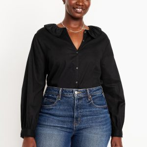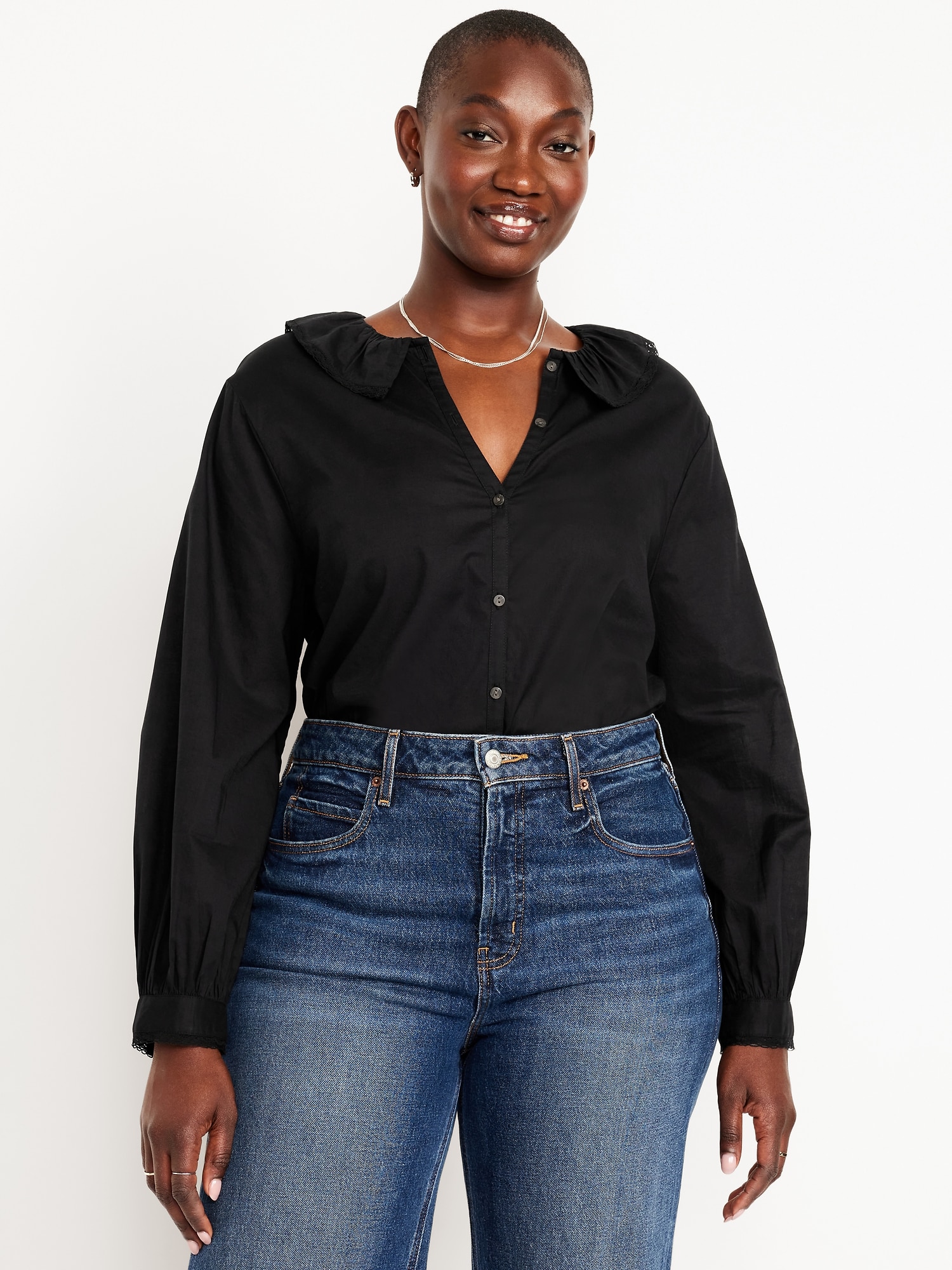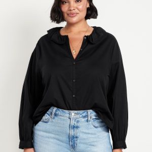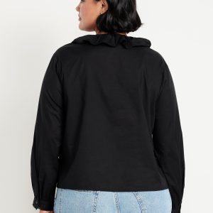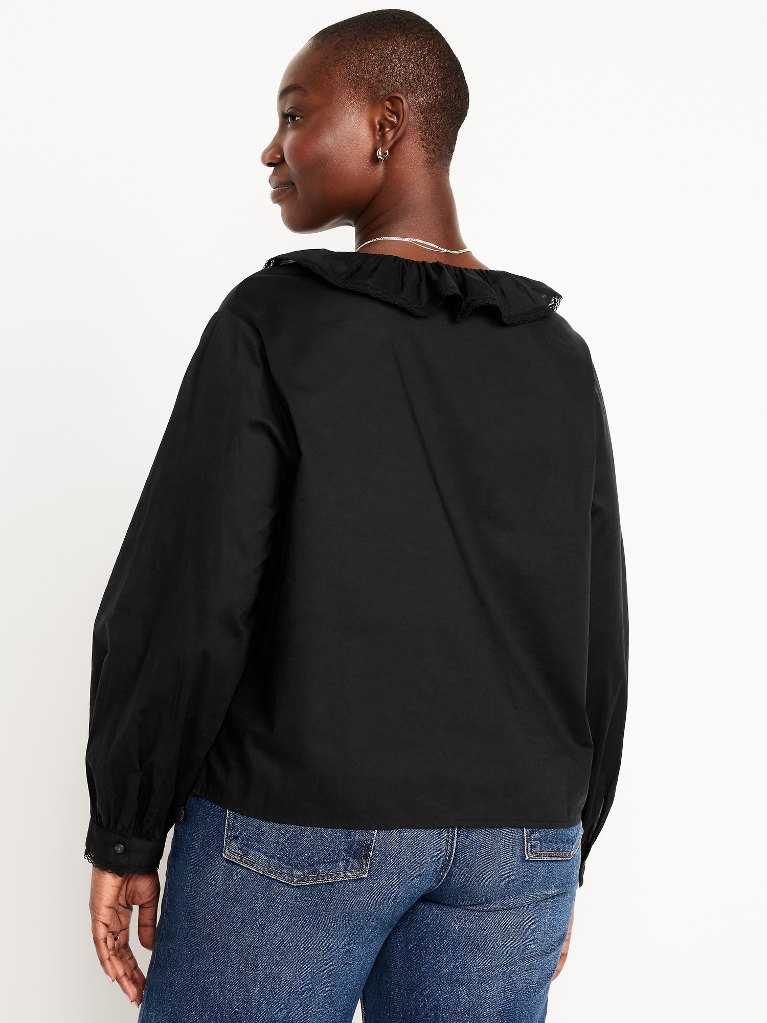 Ruffle Button-Down Shirt: ruffle collar, long sleeves, shirred-button cuffs, full-button front, plaid print, #805732