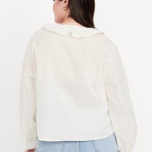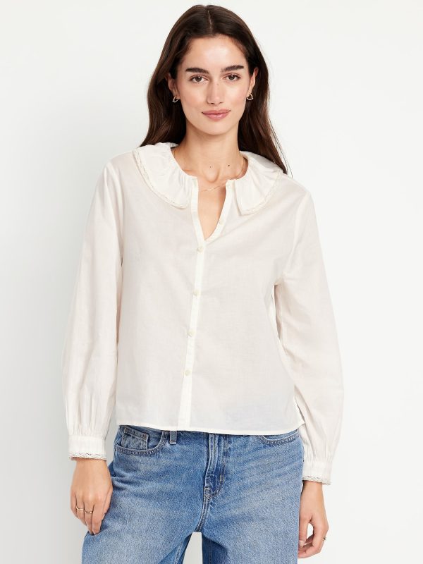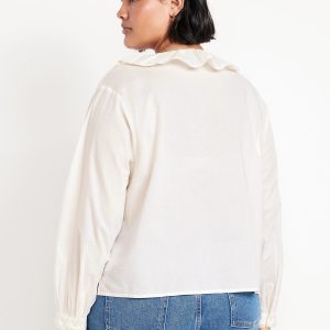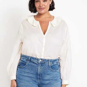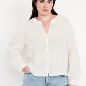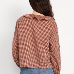 Ruffle Button-Down Shirt: ruffle collar, long sleeves, shirred-button cuffs, full-button front, plaid print, #805732