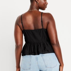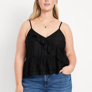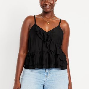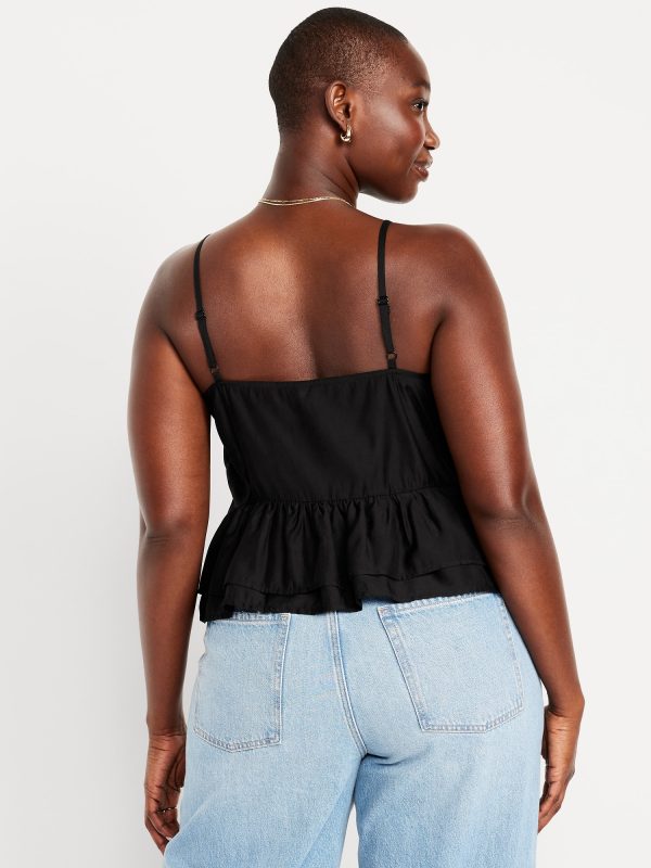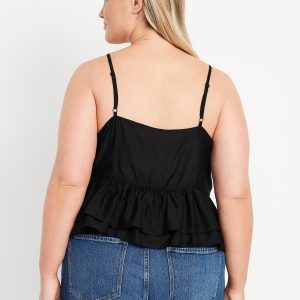 Ruffle Cami Top: v-neck, adjustable spaghetti straps, front ruffle trim, shirred peplum hem, #805745