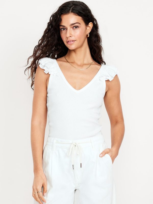 Ruffle-Trim Mixed Material Top: v-neck, ruffled sleeve openings, #686637