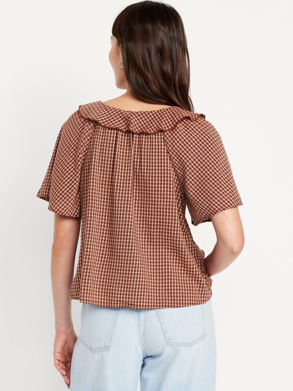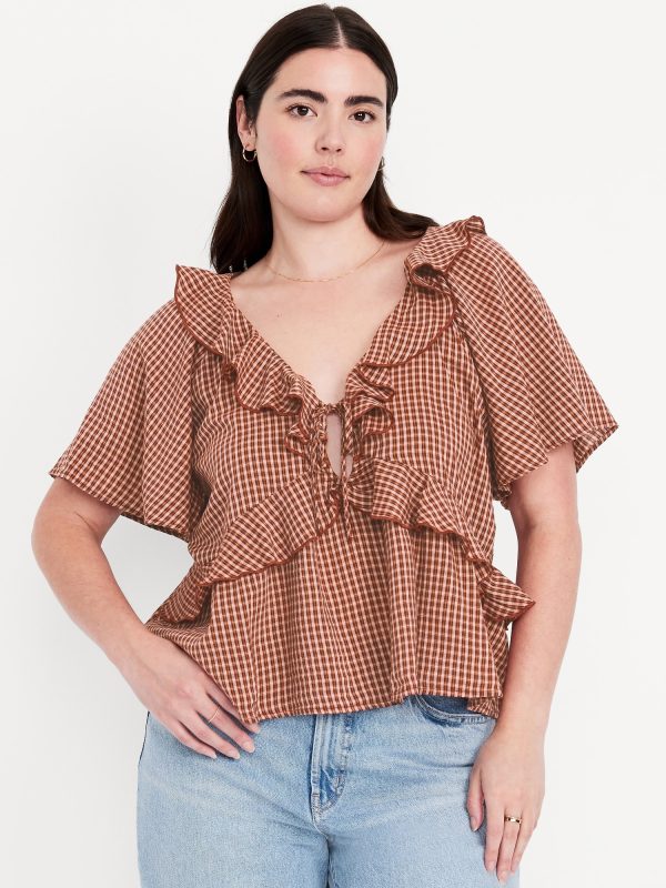 Ruffle V-Neck Top: tie-front v-neck, ruffle overlay at front, short flutter sleeves, #805737